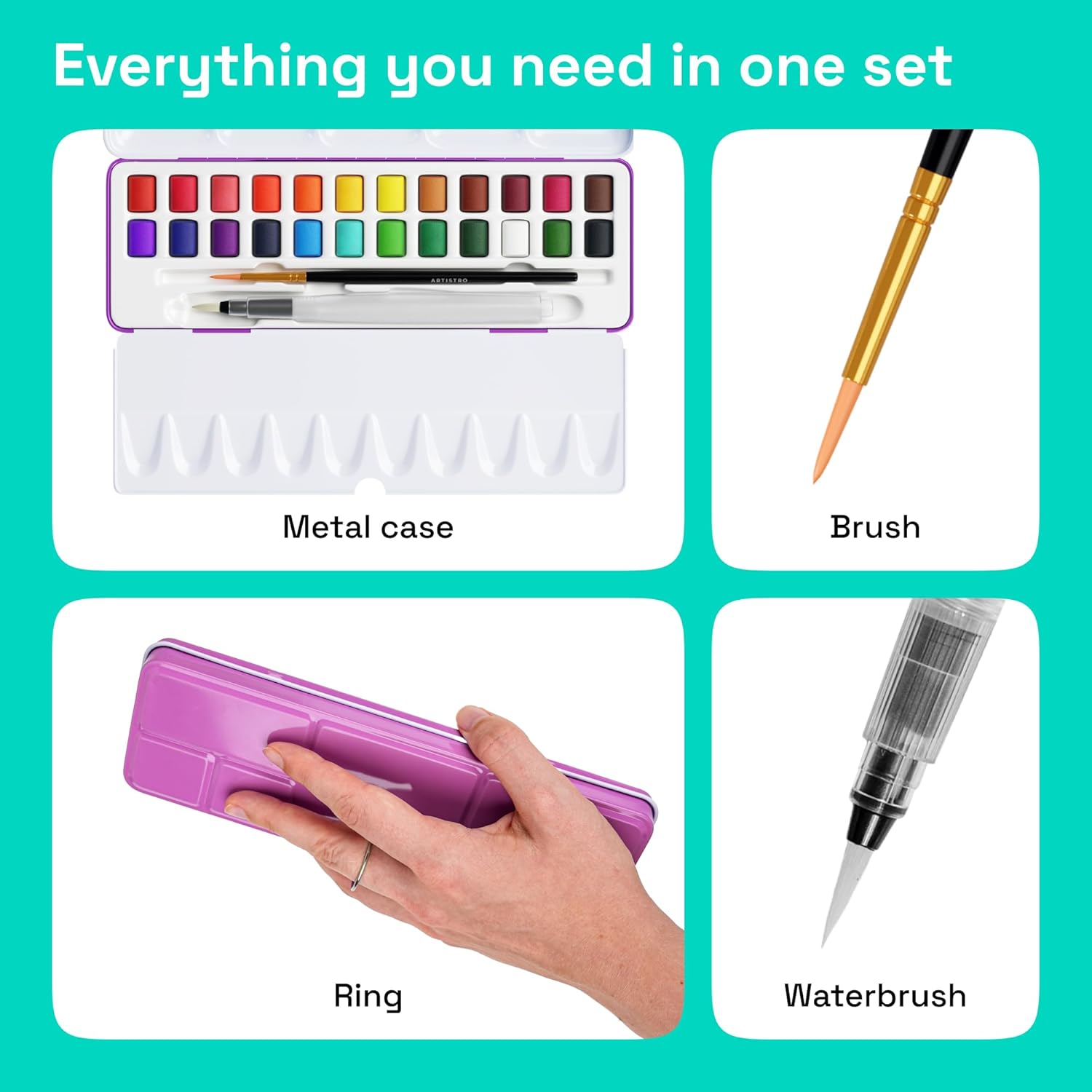 - Included Components : 24 vivid water color paints, metal box, water brush pen, swatch sheet, flexible brush