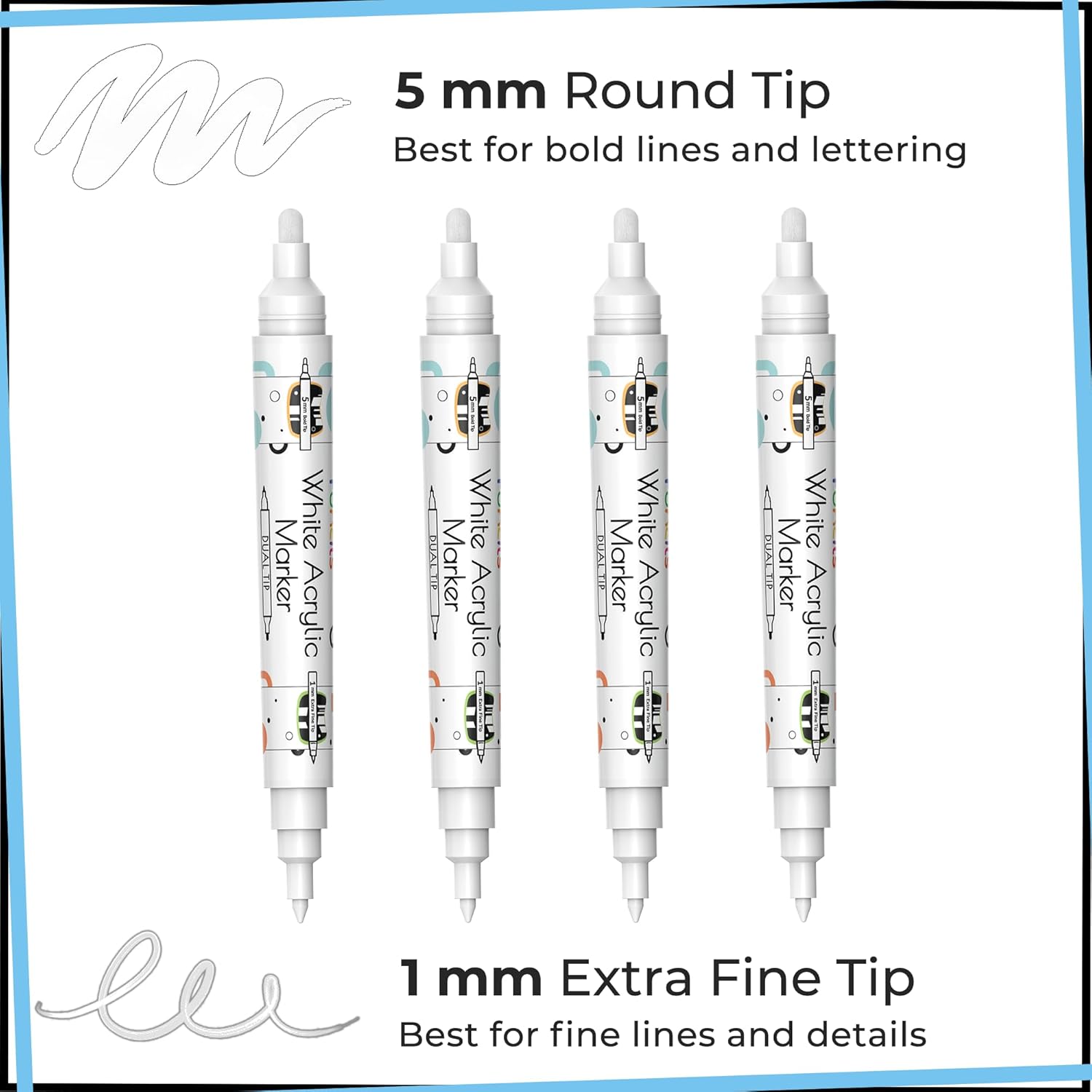- Dual Tip Paint Marker - White Acrylic Paint Pens Fine Tip (1mm) and White Medium Bold Felt tip (5mm) - Thin point is well-suited for precise work or hand lettering & Medium Bold tip used for filling in large areas.