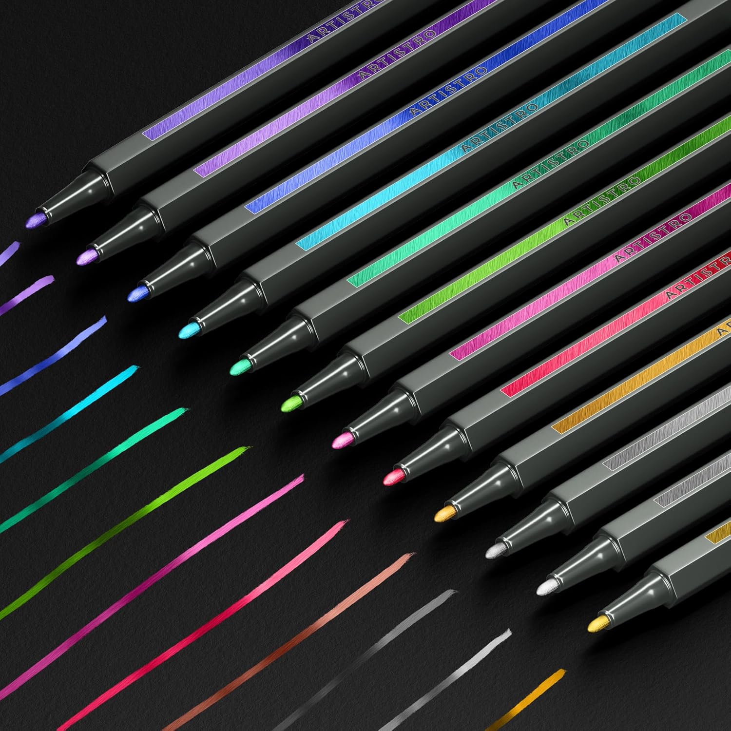 ARTISTRO 12 Metallic Markers with Fine Tip, Metallic Acrylic Paint Pens, Pre-Activated, for Kids & Adults, for Black Paper & Rocks