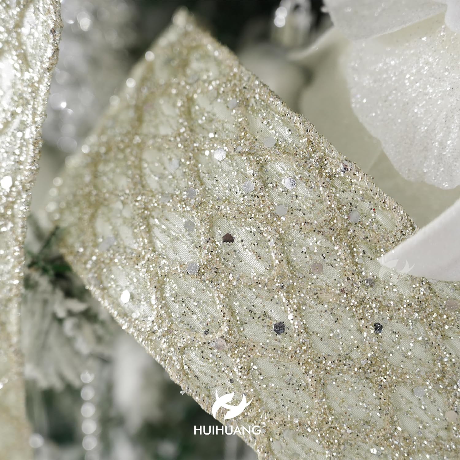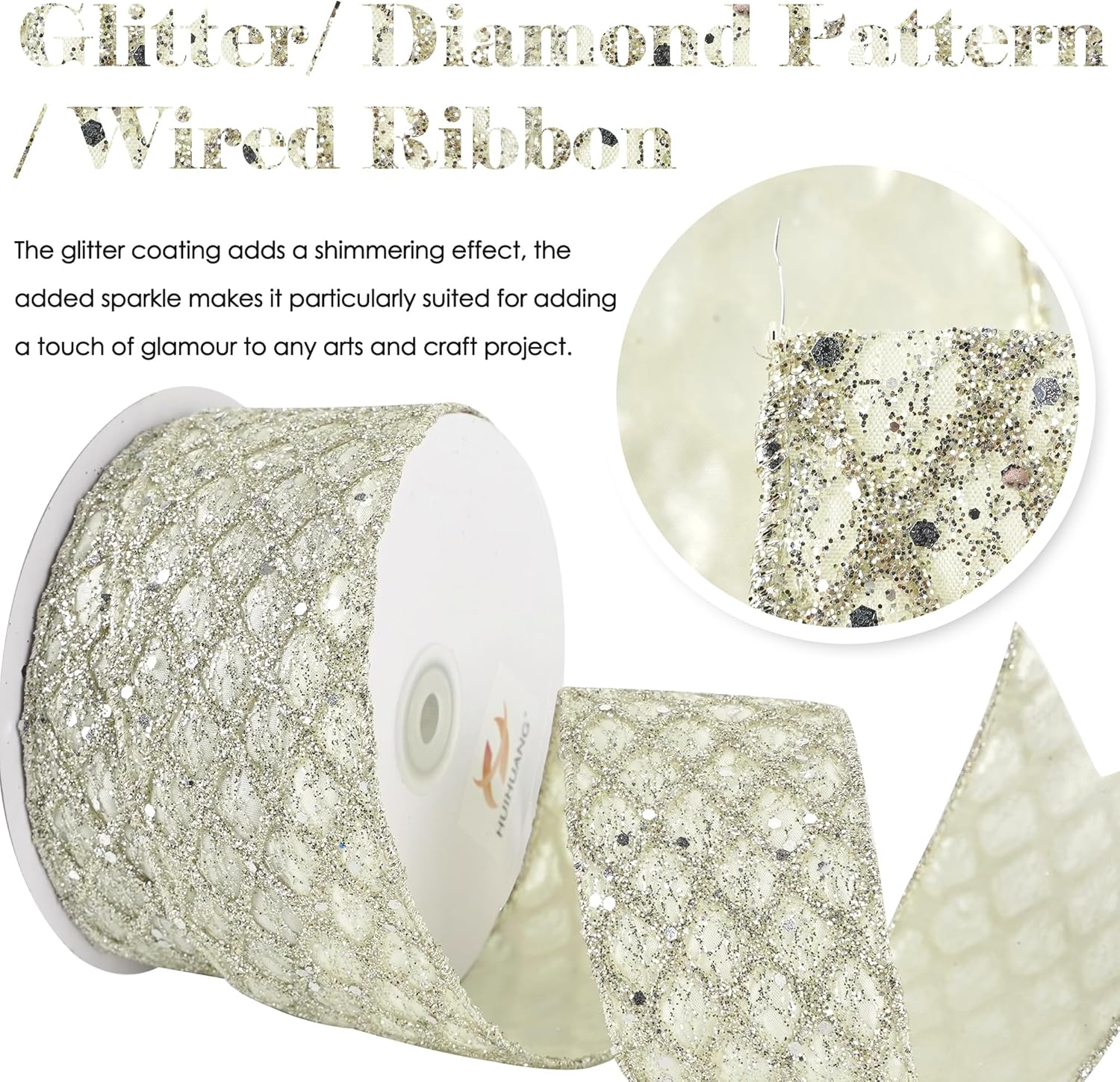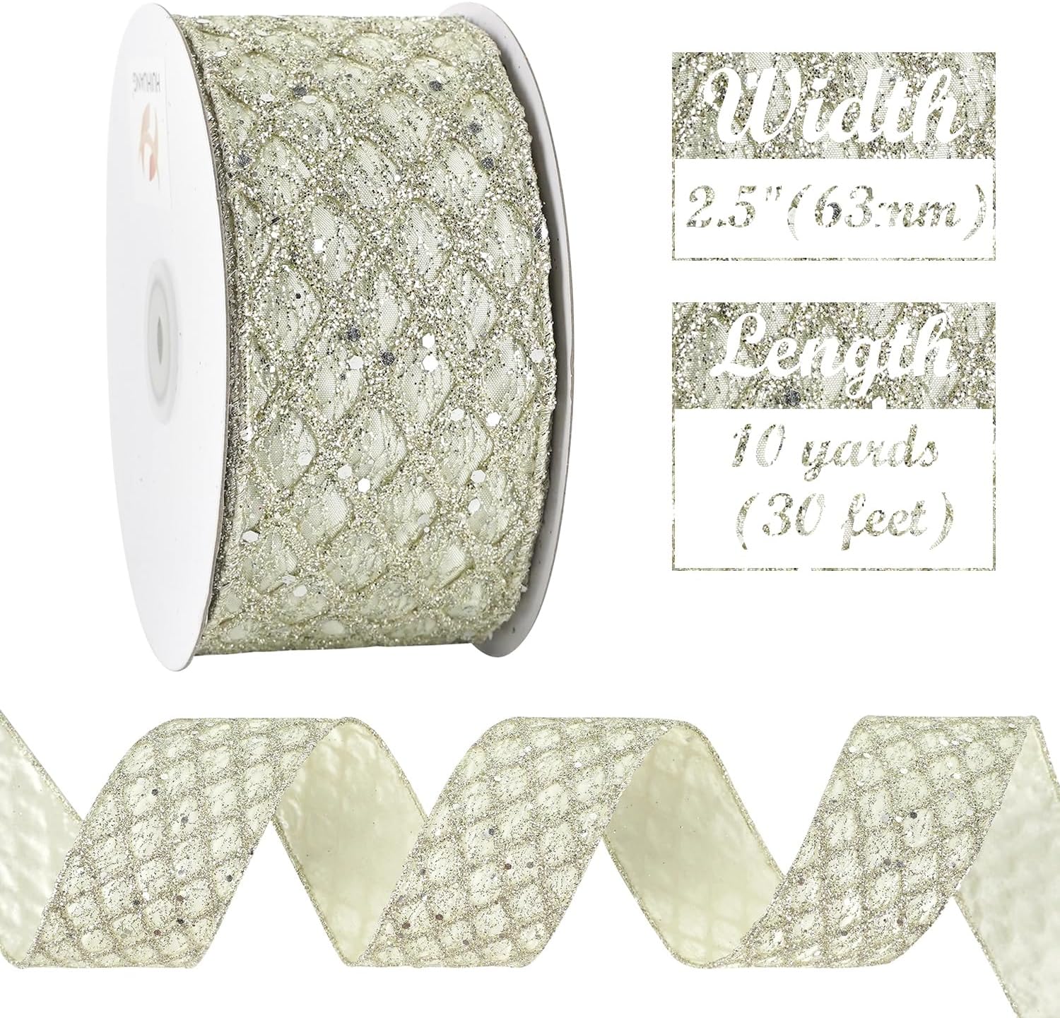 HUIHUANG Champagne Glitter Wired Ribbon for Christmas Tree 2.5 inch Light Champagne Diamond Mesh Ribbon for Tree Decoration, Wreaths, Garland, Gift Wrapping, Bows Making, Home Decor -10 Yards
