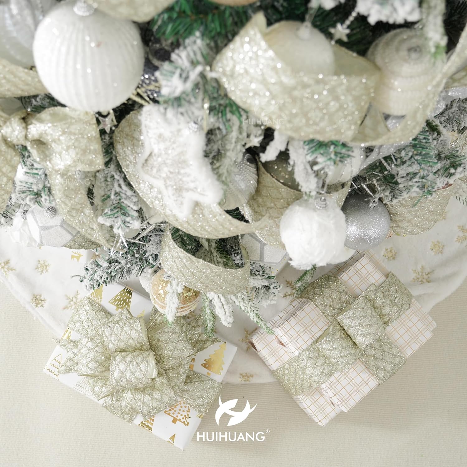 - Application: This ribbon can be used in a variety of Christmas decorations, including tree trimming, wreaths, garlands, gift wrapping, table centerpieces, swags, door hanger, lantern, tree topper bows, champagne color theme Chrisrmas decor etc
