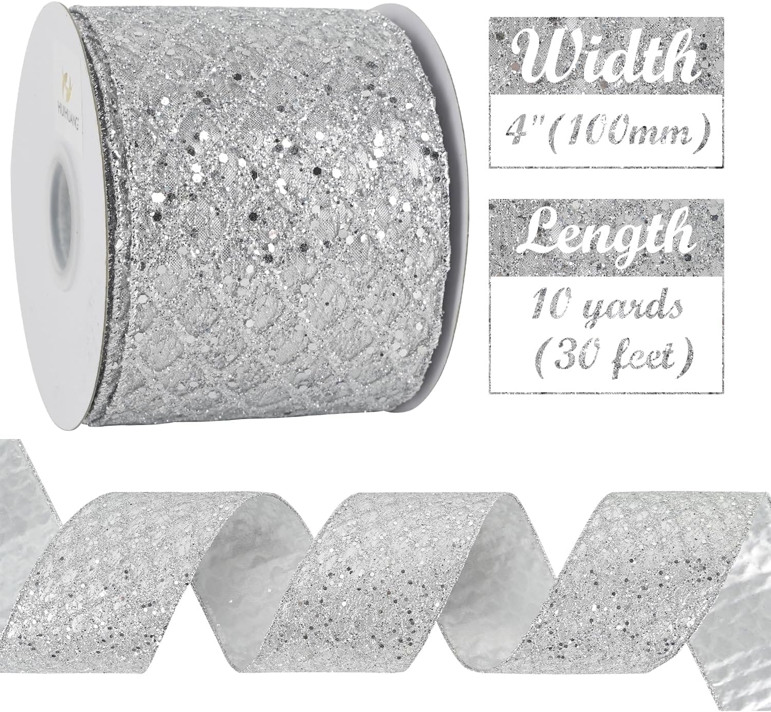 HUIHUANG Silver Christmas Ribbon 4 inch Silver Glitter Wired Ribbon Diamond Mesh Wire Ribbon for X-mas Tree Decorations, Wreaths, Garland, Large Bows Making, Home Decor -10 Yards