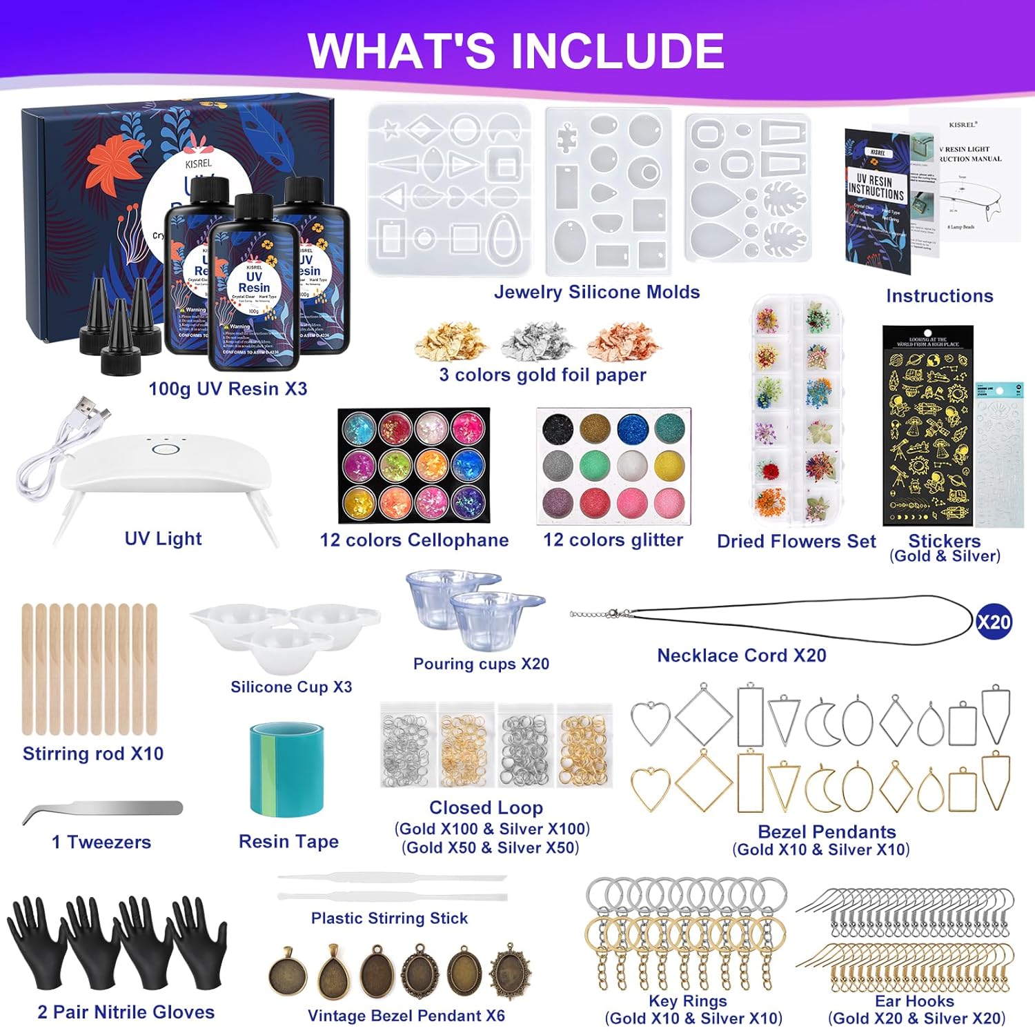 - 💎【UV Resin Jewelry Kit】:UV Resin Jewelry Kit includes 300G of high transparency clear resin, upgraded UV lamp, 3 pcs of multi-shape resin molds, 12 colors of glitter, 12 kinds of cellophane paper, 12 kinds of dry-pressed flowers, 3 colors of gold foil paper, multi-shape two-color border pendant, two sheets of stickers, necklace cord, key ring, ear hook, resin tape, tweezers, silicone cups, stirring rod and plastic stirring rod, Gloves, user manual.