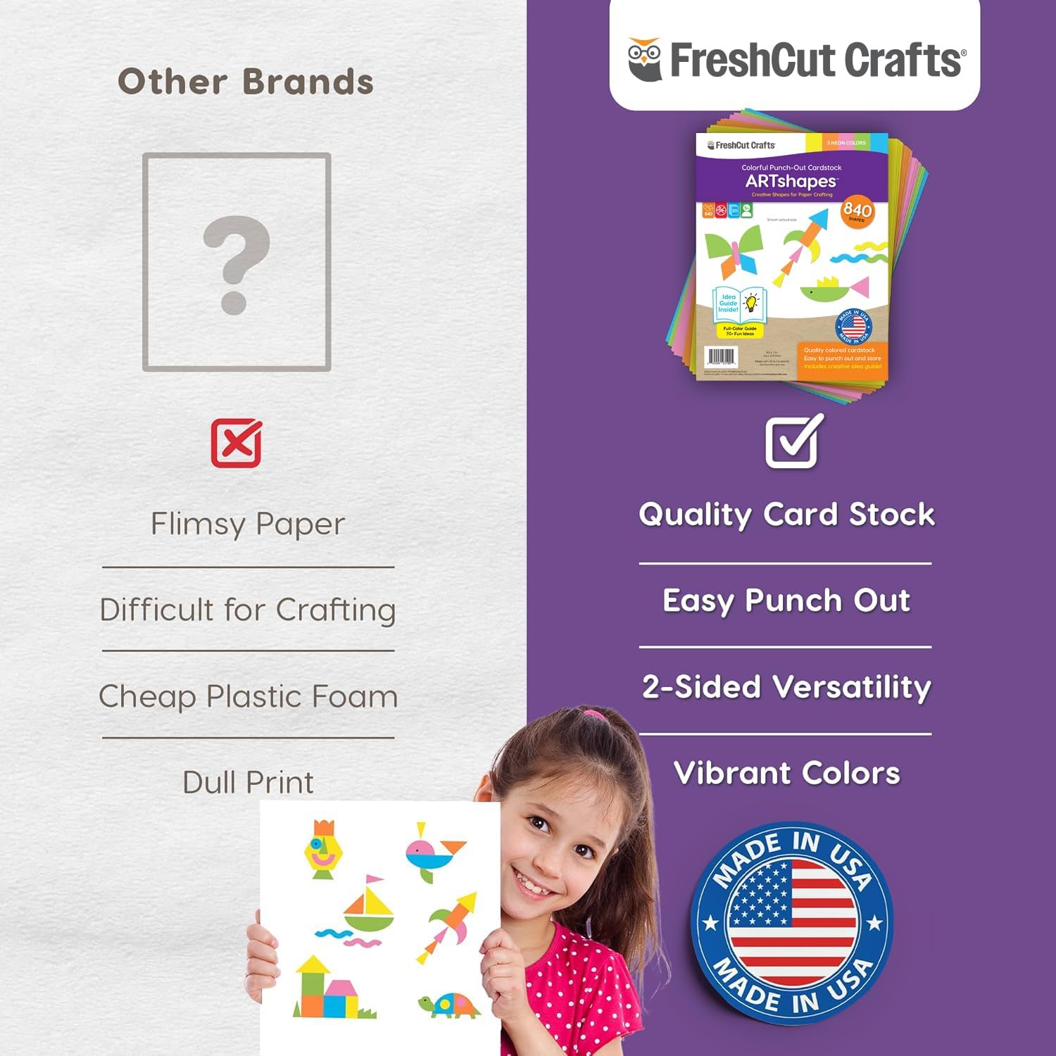 - HIGH-QUALITY CARD STOCK: Pack includes 20 sheets of sturdy, high-quality US Made cardstock that holds easy punch-out shapes in 5 bright colors. 840 pieces in total. Our products are NOT printed, NOT construction paper, NOT foam shapes!