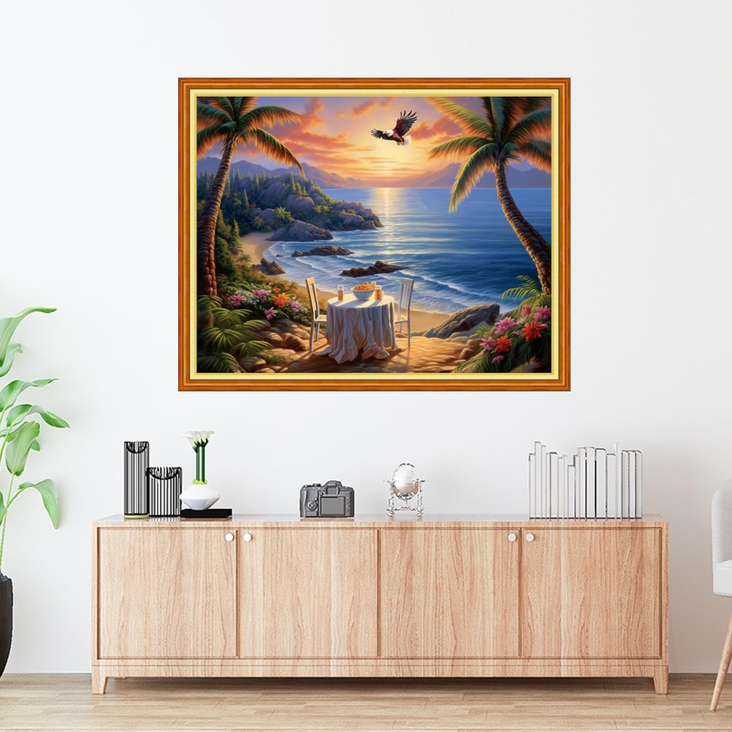 Foxdiviy Stamped Cross Stitch Kits Full Range of Embroidery Needlework Starter Kits for Beginners Adults 11CT Embroidery Patterns Art Crafts DIY Needlepoint Kits-Drinking tea by the seaside 16x20 inch