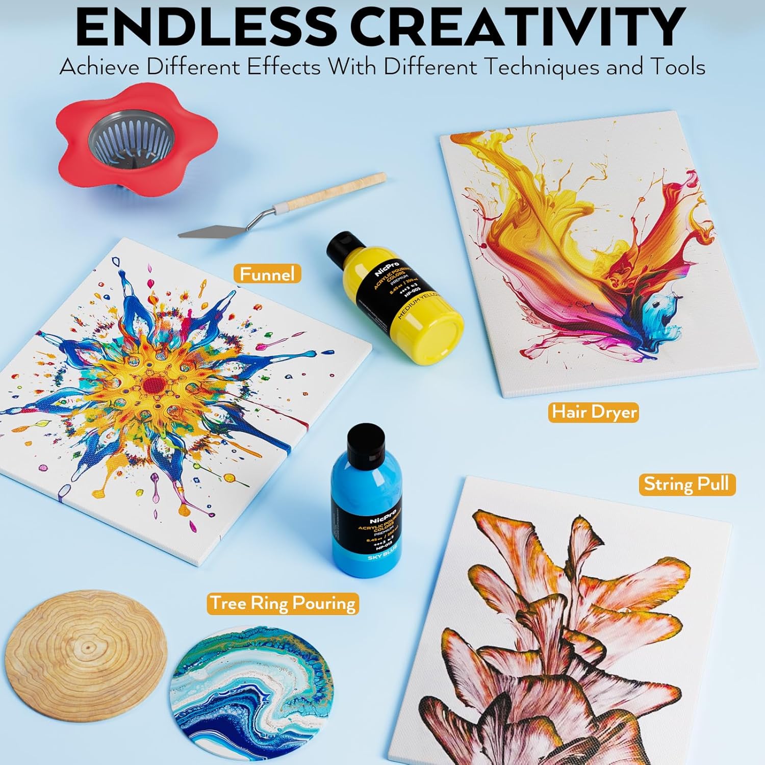 - Enjoy Pouring Fun: With features of pre-mixed, high flow and high pigments, the Nicpro Acrylic Pour Paint will be a great choice to make stunning craft works. You can have fun with your friends or kids with pouring paints
