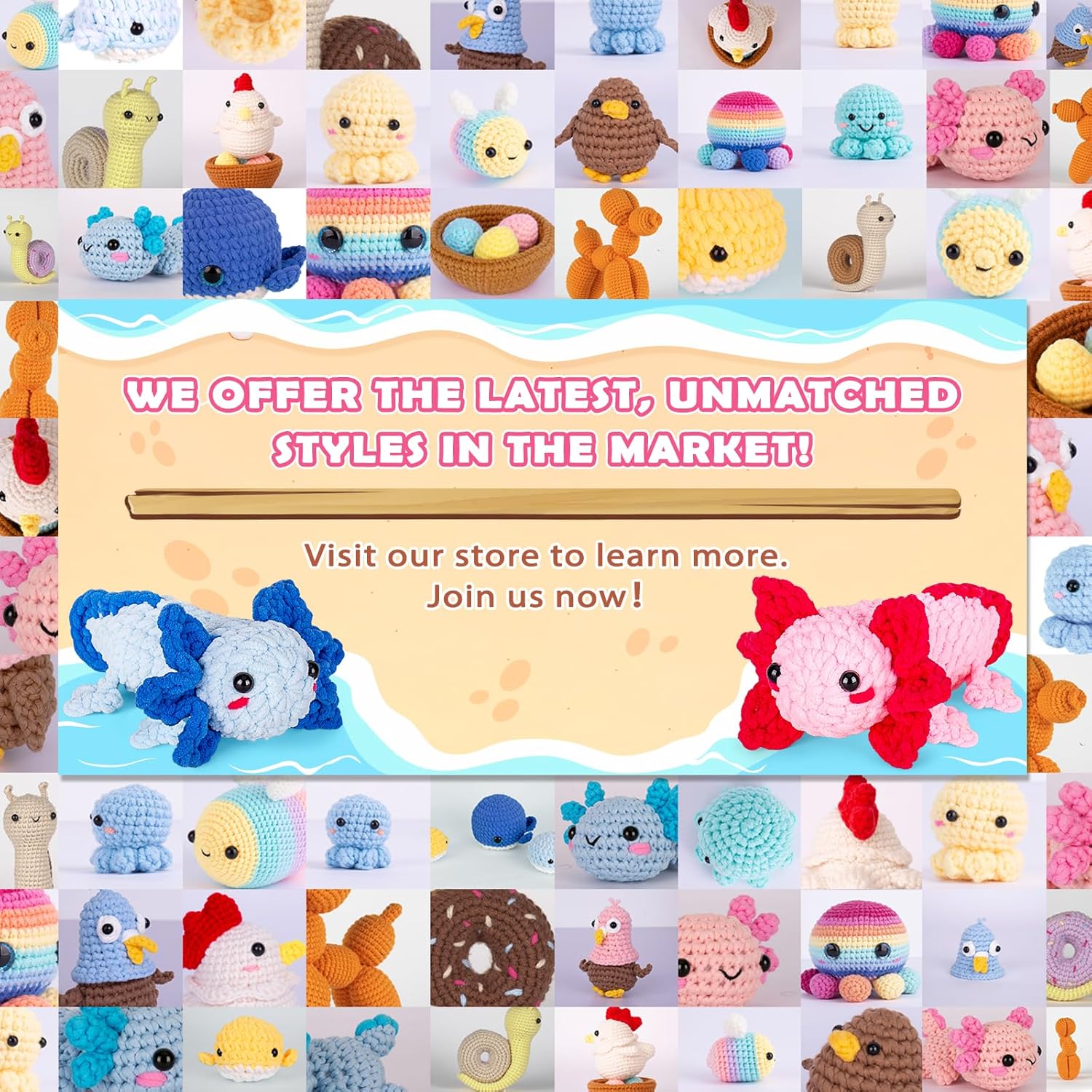 - All-In-One Crochet Kit : Our beginner crochet kit equipped with everything you need to start: 5 skeins of Beginner-Friendly Yarns, ample stuffing, a needle, 5 marker buckles, 4 safety eyes, 2 large crochet hooks, a pair of scissors, a crochet axolotl pattern, and a beginner's basic crochet manual.