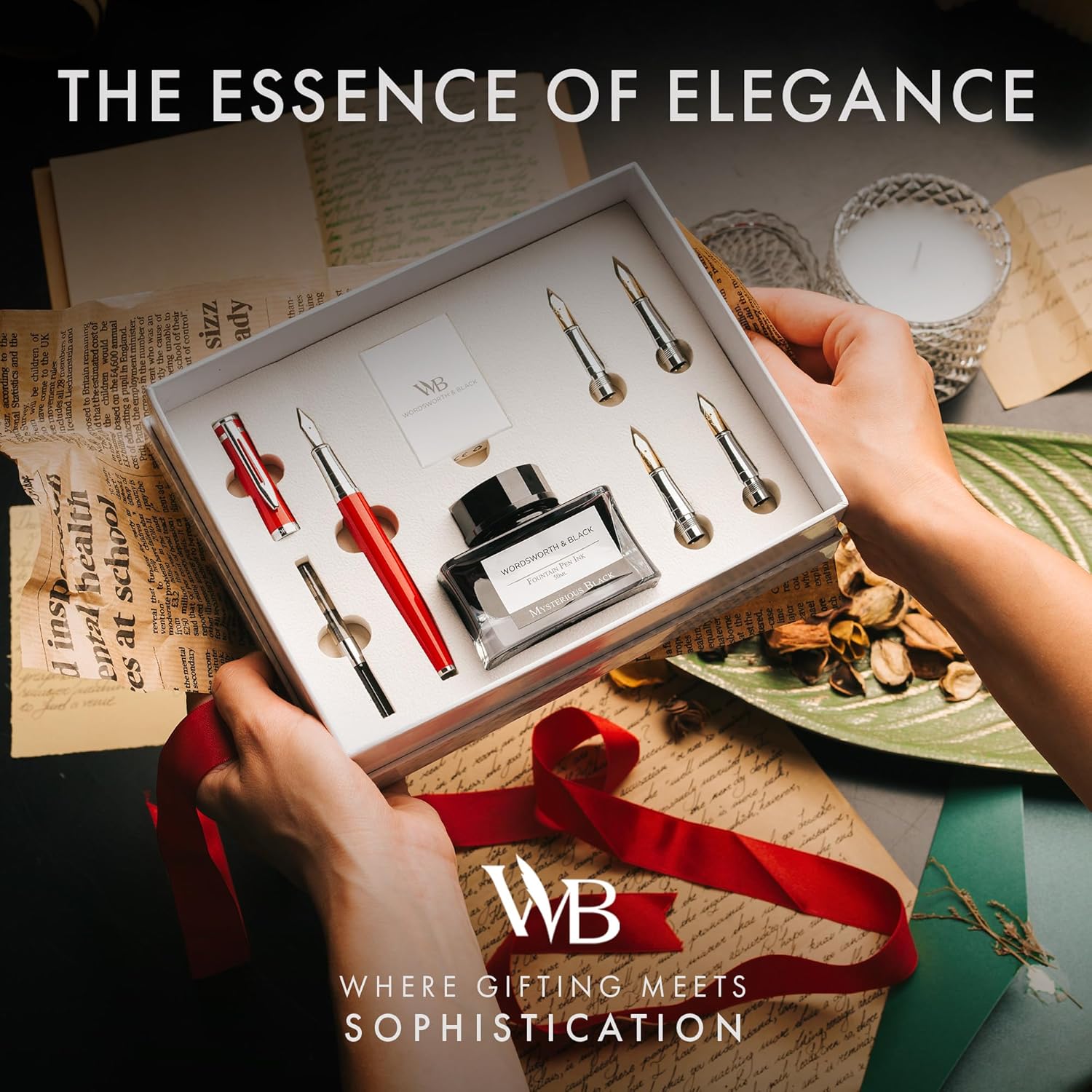 Wordsworth & Black Fountain Pen Gift Set, Includes Bottle, 6 Cartridges Refill Converter, 4 Replacement Nibs, Premium Package, Journaling, Calligraphy, Smooth Writing Pens [Red Chrome]