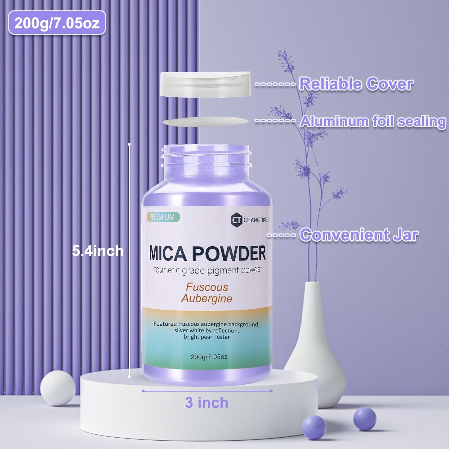 - 【Super Surprise Color Combination】:Our Fuscous Aubergine mica powder net weight is 200g/7.05oz large bottle. Just a little mica powder can bring a very gorgeous effect.With its shiny surface,this mica powder pigment provides a gorgeous and lasting effect for your artistic creation.