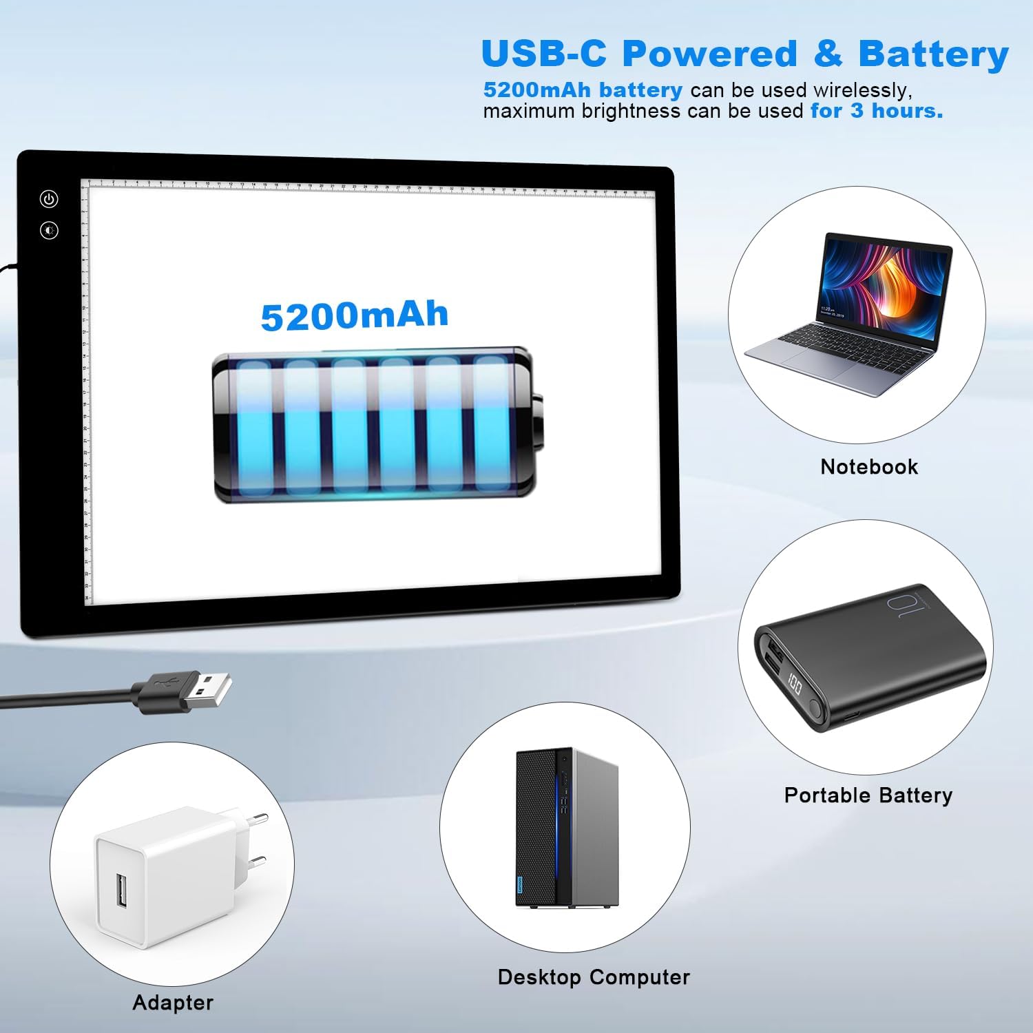 LUXJOYFUL A2 Large Rechargeable Light Box for Tracing,Diamond Painting Light Board 3 Color and stepless dimming,Built-in 5200mAh Battery,Ultra-Thin LED Light Pad for Drawing Vinyl Weeding Animation