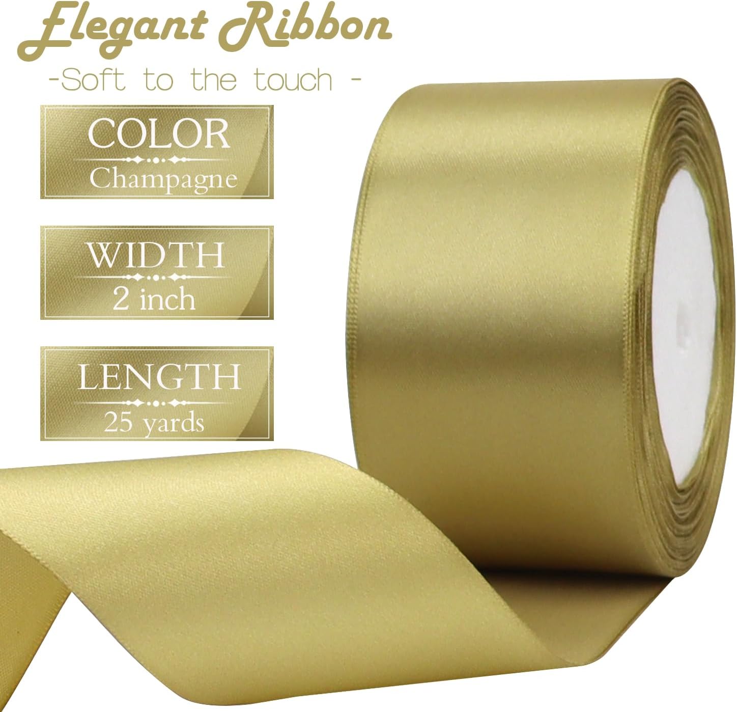 Champagne Gold Solid Satin Ribbon 2 Inch 25 Yards Solid Polyester Fabric Ribbon for Gift Wrapping Wedding Christmas Baby Shower Birthday Party Decoration Handmade Immortal Flower Craft