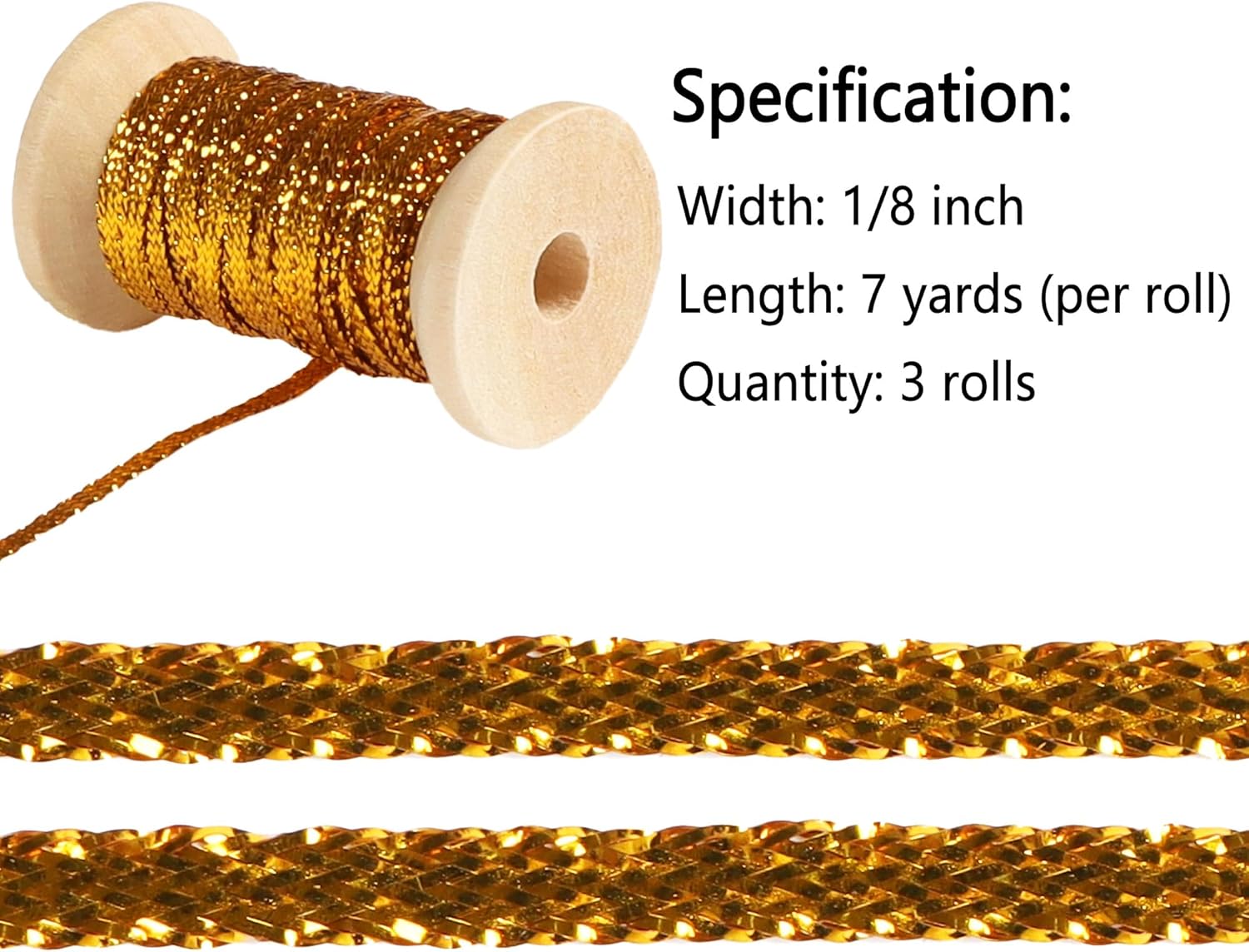 Gold Thin Ribbon 1/8 inch Metallic Braided Double Faced Ribbons Curling Ribbons for Balloon String Crafts Gift Wrapping Party Wedding Christmas Ornaments Decoration 7 Yard x 3 Rolls