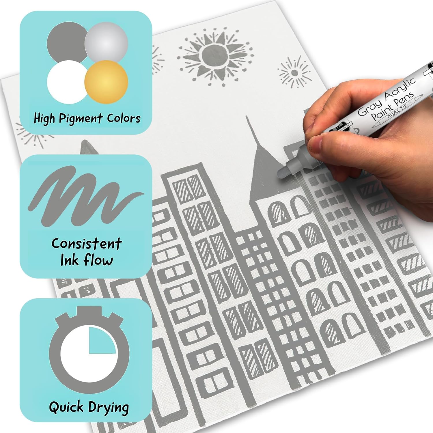 4 Dual Tip Gray Paint Pen Metallic - Fine Tip & Medium Acrylic Paint Markers - Gray Marker for Metal, Wood, Rock Painting, Canvas, Ceramic, Glass, Fabric, Leaf and Plastic - Water-based Ink