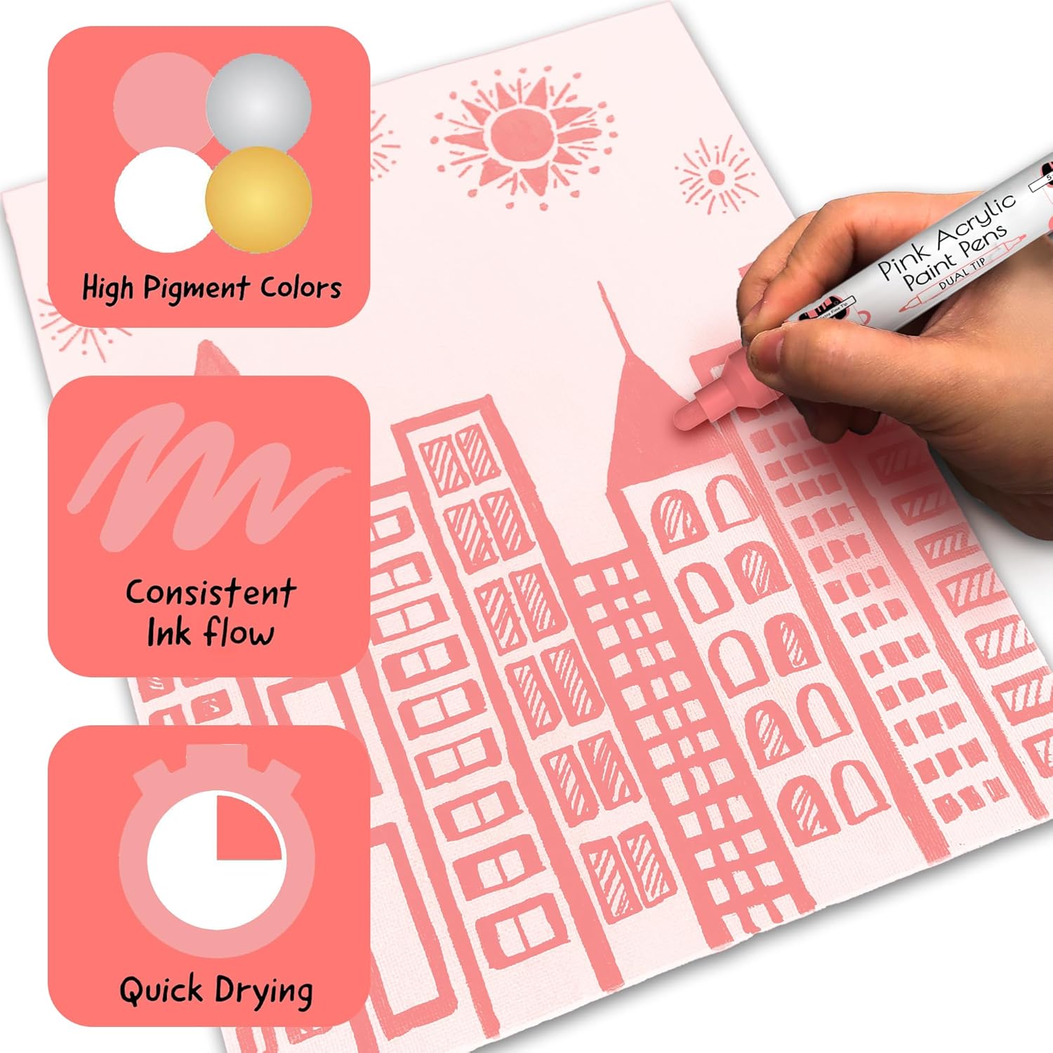 - Pink Paint Pens Metallic - Highly pigmented, Quick to dry & used as paint markers for canvas, paint markers for wood, or as glass paint markers, rock painting pens, on wine glasses & ceramic paint pen (dishwasher safe ink)