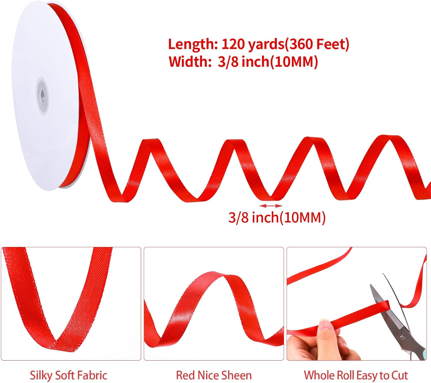 Red Ribbon 120 Yards 3/8 Inch Thin Red Satin Ribbon Craft Fabric Christmas Ribbons for Hair Bow Making Gift Wrapping Floral Bouquet Wedding Party Christmas Decorations