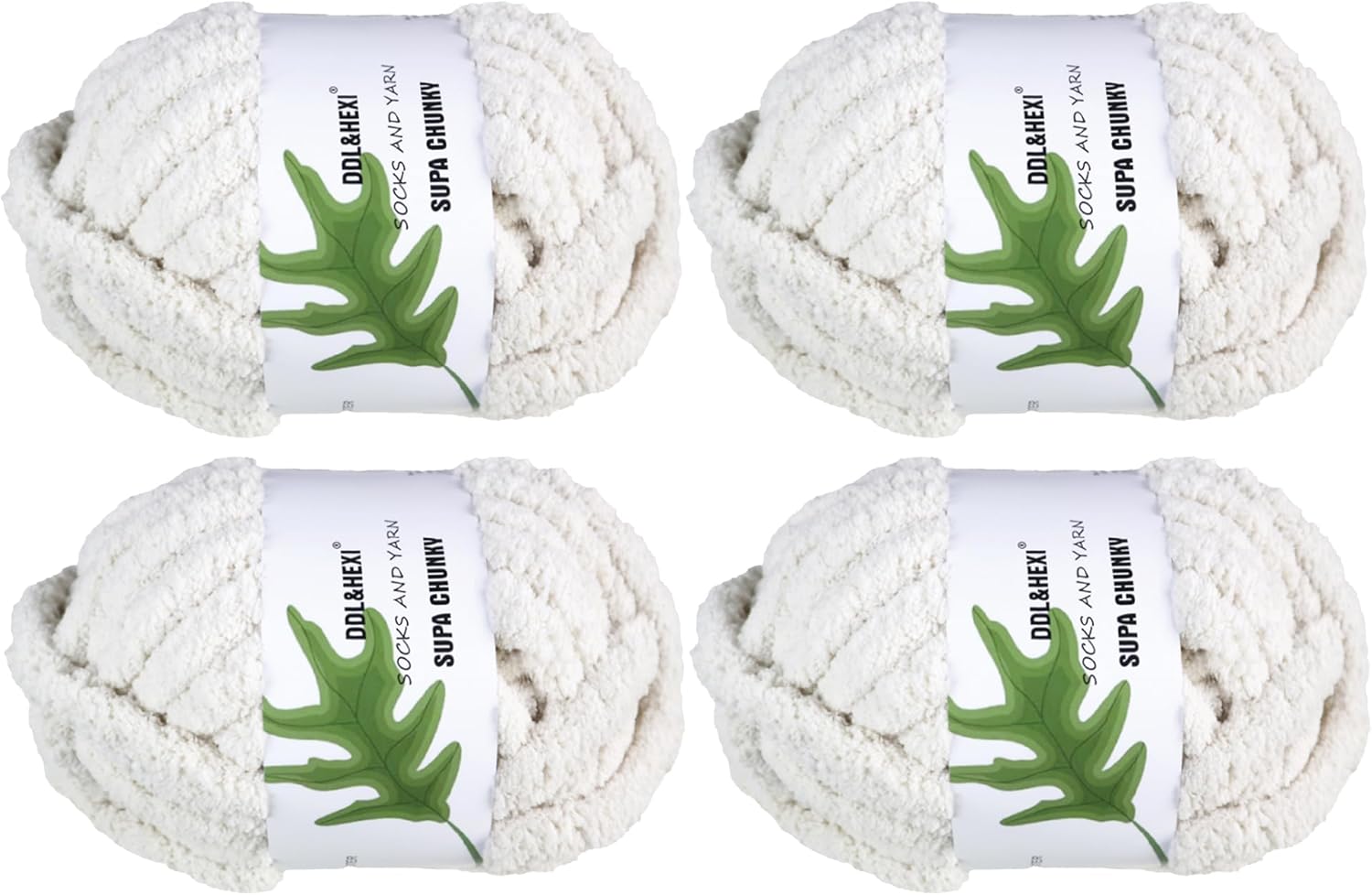 DDL&HEXI 4 Pack Super Chenille Chunky Yarn for Hand Knit, Blanket Making Kit, Jumbo Knitting, 4x8oz (226g) per Bag, Soft Polyester for Crochet, Knitting, and DIY Projects (White-4)