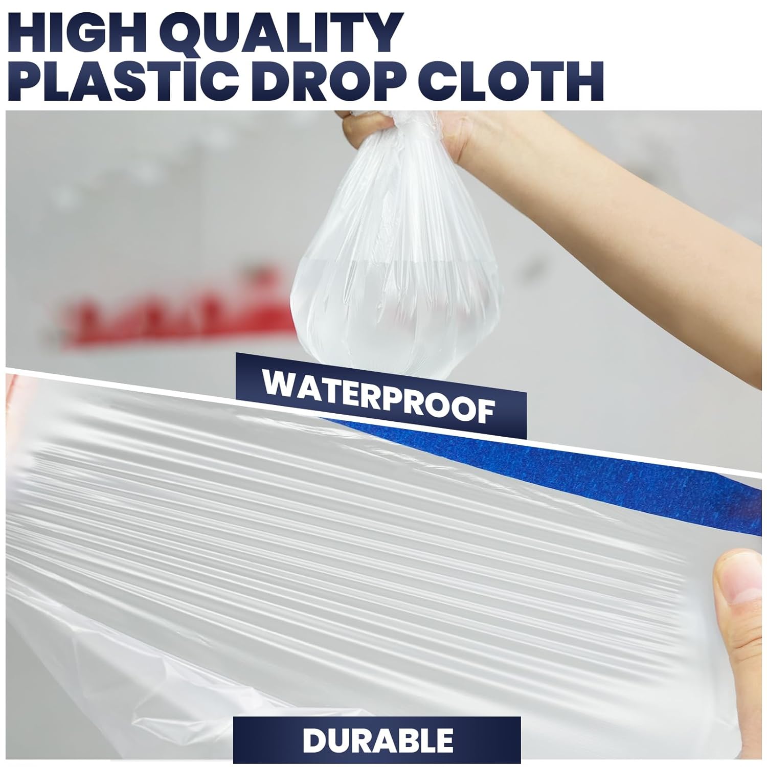 - Strong Adhesion with Clean Removal: The painters plastic with tape uses high-adhesive masking tape that securely sticks to surfaces, ensuring a clean removal within 30 days. No sticky residue is left behind, and it delivers crisp paint lines with no bleed-through.