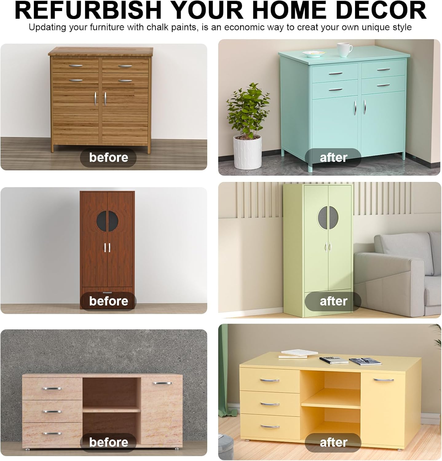 - Low Odor & Non-Toxic: Our chalk paints for furniture is water-based, non-toxic, odorless, safe to used. Can be finished with liquid wax sent to protect the surface and enhance the desired look. The most economical choice for refurbishing old wood furniture for begginer and professionals!