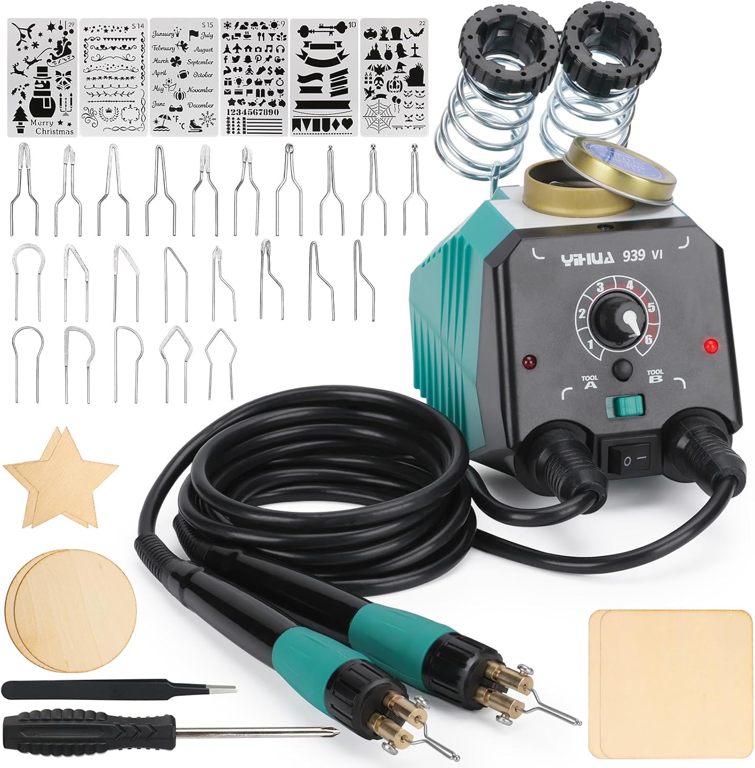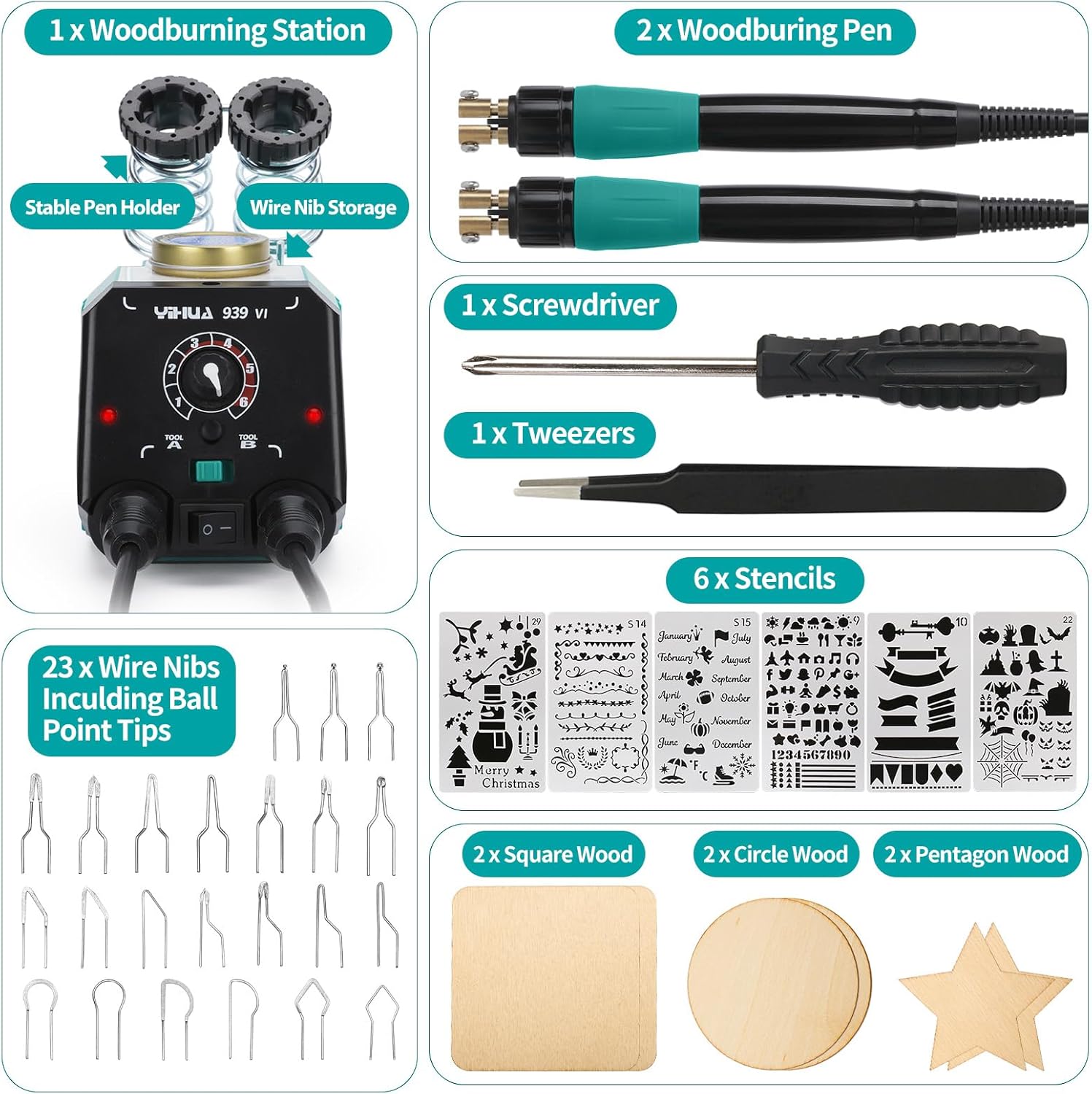 YIHUA 939-VI Dual Wood Burning Pen Wood Burning Kit with 23 Wire Nib in Varied Shapes, Detachable Pyrography Pen, 6 Wood Pieces, 6 Stencils and Screw Driver, Tweezers Used as Wood Burning Tool