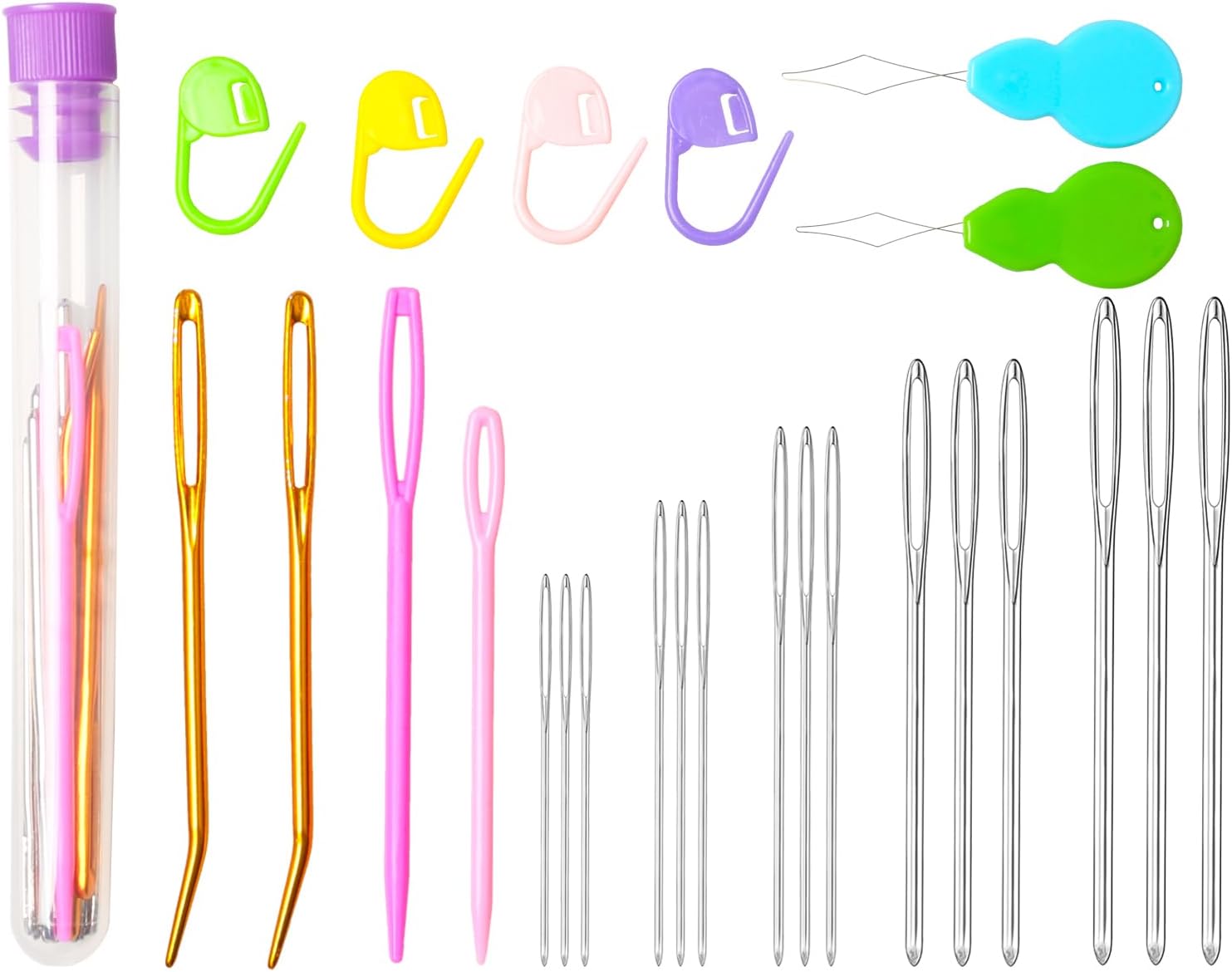 - Package Include - 15pcs large eye blunt needles, 2pcs bent yarn darning tapestry needle, 2pcs plastic sewing needle, 2 threaders & 4 sttitch markers, total 25pcs in a storage container, differen kinds of sewing blunt needles to meet your daily needs and replacements. There are metal, plastic and bend ends for sewing, weaving in ends and darning any yarn project needed. The container makes it easier to keep track of your needles and will make finishing all of your projects a breeze.