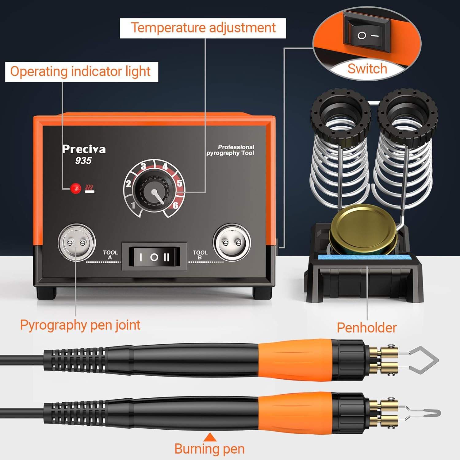 Preciva 935 Dual Handle Wood Burning Kit - Professional Pyrography Tool with 20 Wire Nibs & Pen Holder | Adjustable Temp 482~1382℉ | for Wood Burning, Leather Craft, Art Designs
