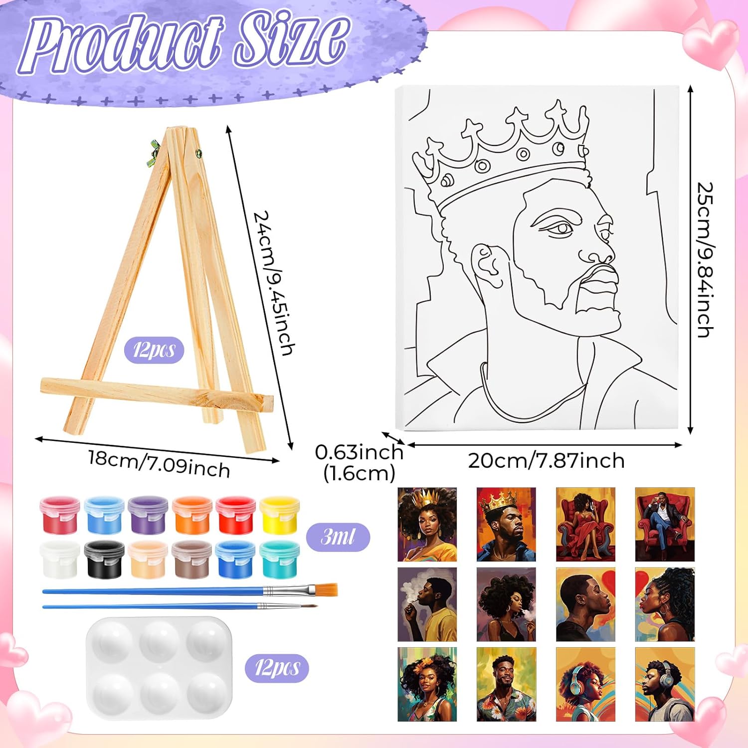 - Value Package: pre printed canvas for painting package includes 12 pre painted canvases, 12 paints in12 colors, 12 flat pen, 12 pointed pen, 12 palettes in 6 colors, 12 wooden easels; Whether you have an art party or just want to relax and paint, canvas with pictures to paint has got you covered; Note: The paint set is placed in the back of drawing board