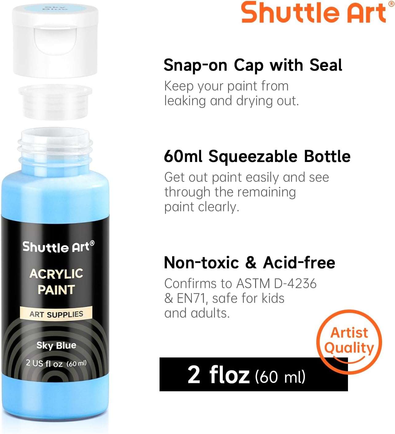 Shuttle Art 100 Colors Acrylic Paint, 2oz/60ml Bottles, Include 2 Sets of 12 Paint Brushes, 1 Art Sponge & Palette, Premium for Artists, Beginners & Kids on Canvas Rocks Wood Ceramic