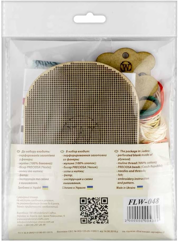 - Package contents: figured perforated plywood blank, foamiran or felt, mouline thread (100% cotton), beads Preciosa, a needle, thread and a needle for bead embroidery, instruction and embroidery scheme. The kit is packed in a bag with a euro loop. Dimensions: 11*13 cm / 4.33*5.12 in. Number of colors: 32. Number of beads: 100.