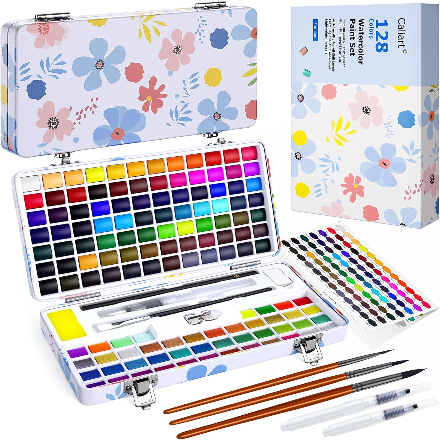 Caliart Watercolor Paint Set, 128 Colors with 4 Brushes Metallic Color Palette Kit, Portable Travel Watercolors Painting Gifts for Adults Artists Painters Beginners Art Supplies