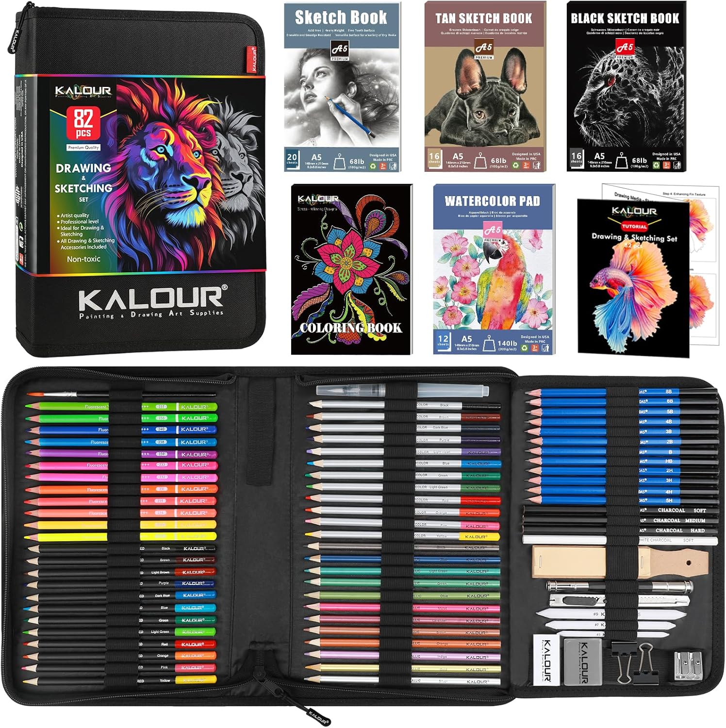 82 Drawing Set Sketching Kit, Art Set with Fluorescent, Colored, Watercolor, Metallic, Graphite, Charcoal Pencils, 5 Sketchbook and Coloring Book, Gift for Artists Adults Teens Beginner