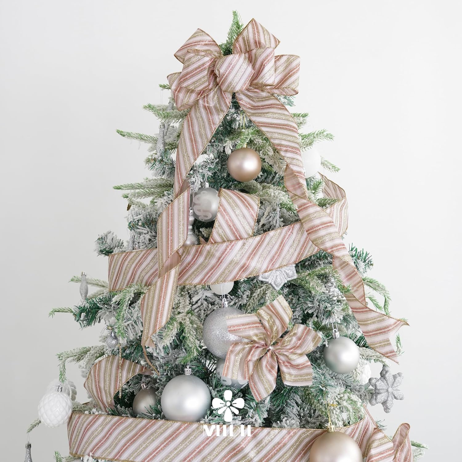 MEEDEE Pink Diagonal Striped Ribbon 2.5 Inch Blue Satin with Rose Gold and Champagne Glitter Wired Ribbon for Christmas Tree, Garlands, Wreaths, Topper Bow (10 Yards)