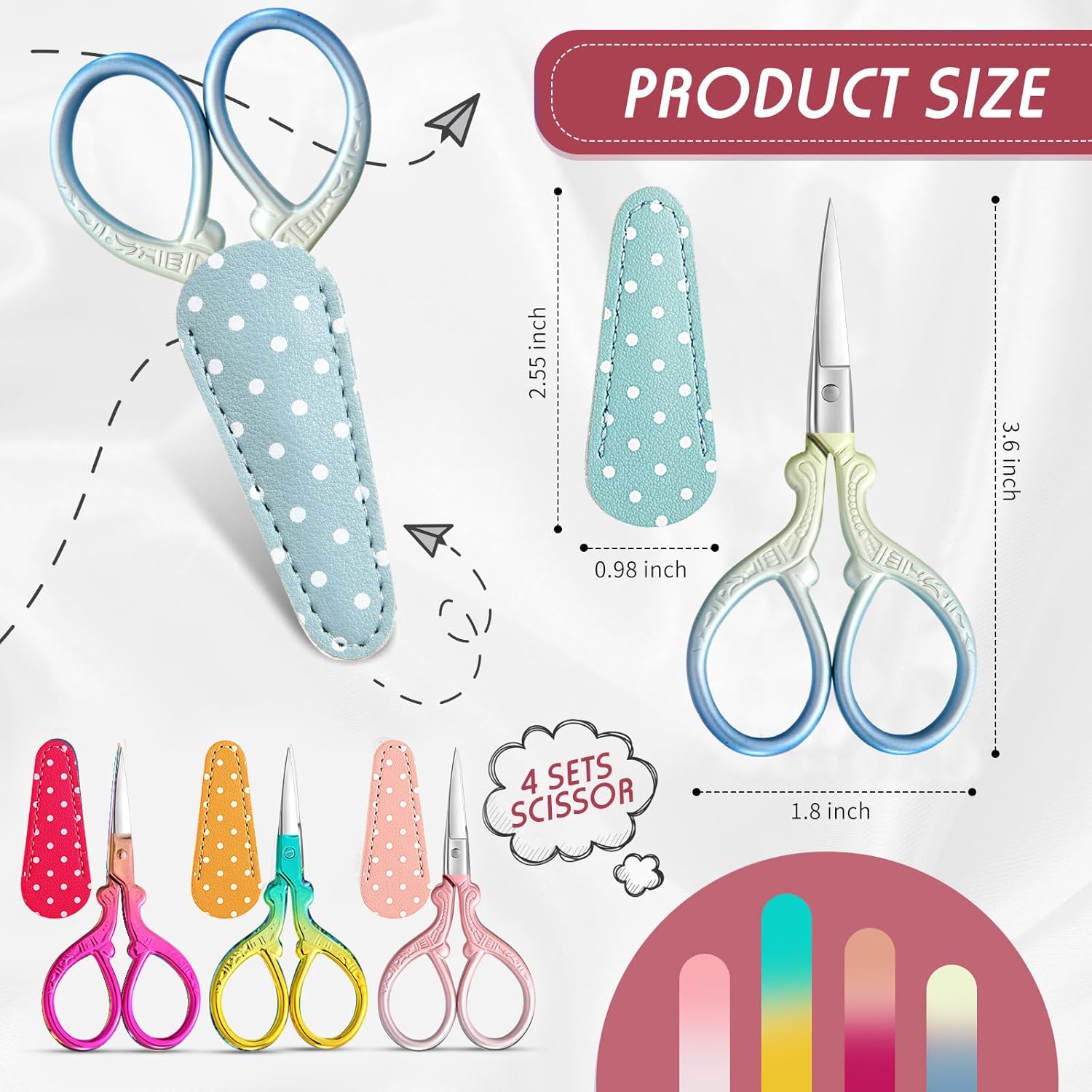 - What you receive: 4 pieces of sewing embroidery scissors in 4 different colors, and 4 pieces of artificial leather covers that can prevent the scissors from scratching or being directly exposed to the air, sufficient to meet your needs for sewing, DIY crafting or others