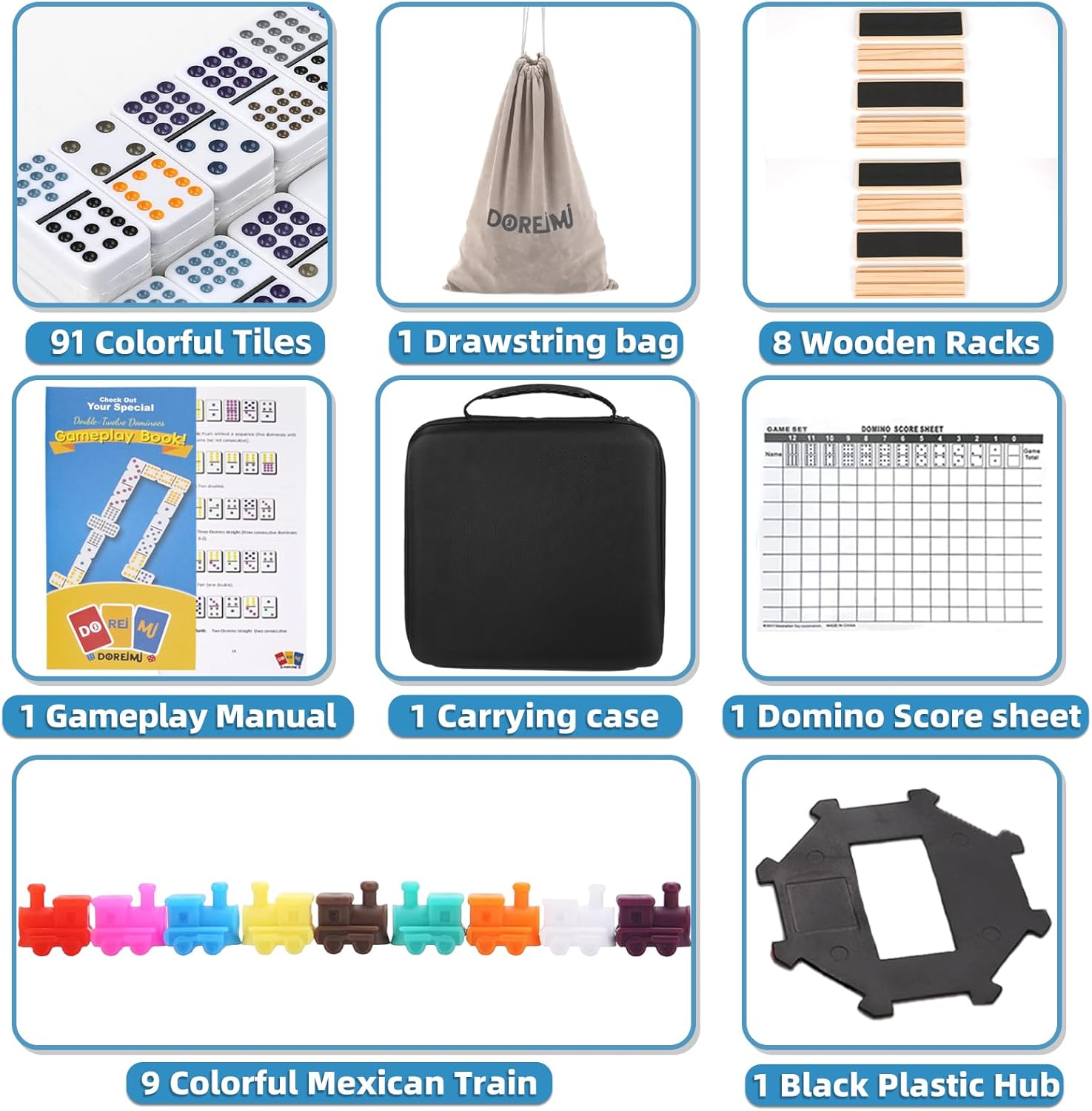 - 8 in 1 Mexican Dominoes Set: This domino board game Set is designed with 91 dot domino tiles, 8 travel holders, 1 EVA case,1 drawstring bag, 9 trains, 1 exclusive game manual, 1 scorebook and 1 hub