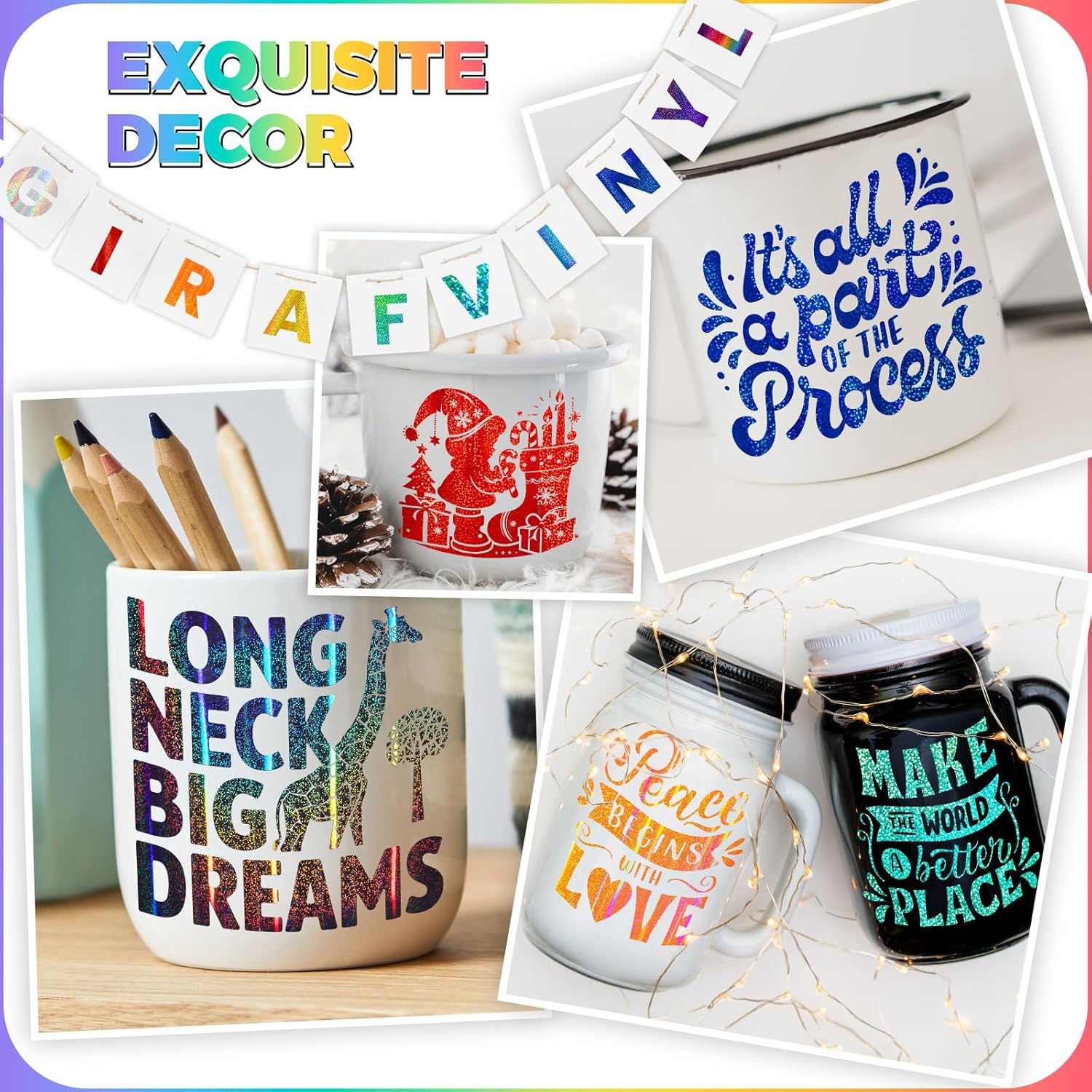 - Holographic Vinyl Package: This holographic vinyl set including assorted glitter vinyl x 9, gorgeous holographic vinyl x 4, gradient rainbow vinyl x 3, holographic broken glass vinyl x 4. Each self-adhesive vinyl sheet is unique in color, meeting your color needs