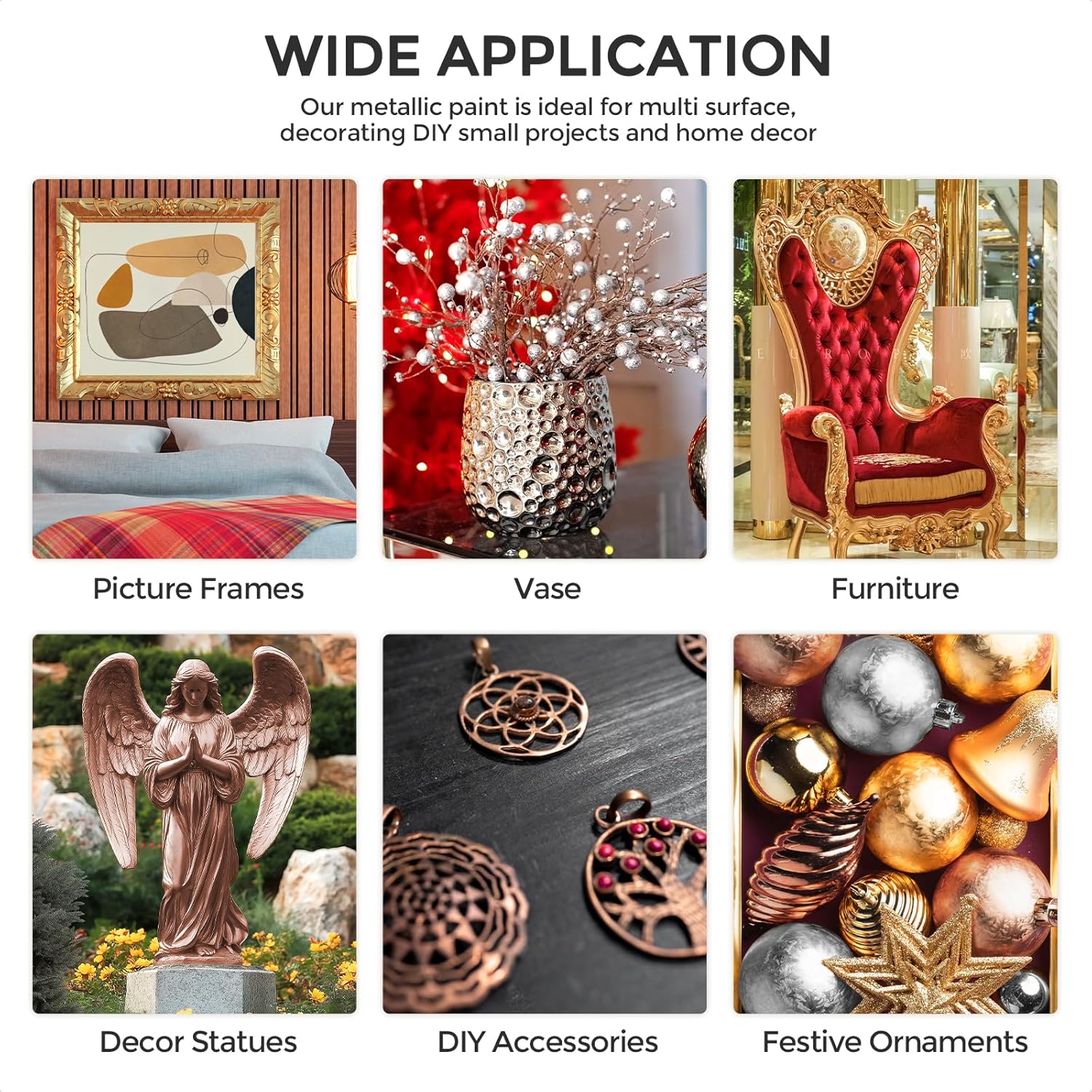 - Stunning Metallic Finish: Nicpro metallic acrylic paint set includes 3 essential colors—gold, silver, and copper. Each dries to a glossy, reflective finish that adds shimmer and depth to any project, from canvas art and crafts to furniture accents and DIY décor. A perfect alternative to leaf paint for modern metallic effects.