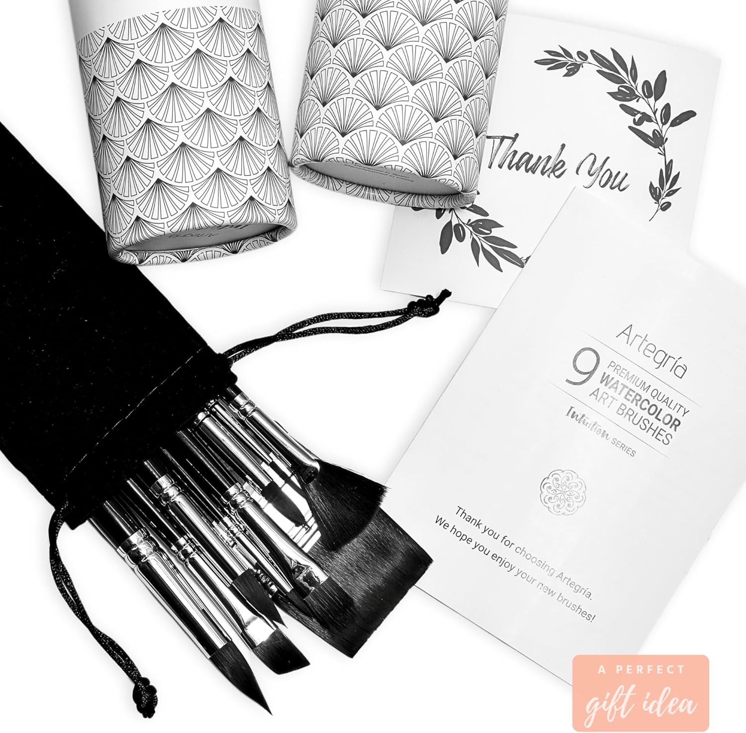 ARTEGRIA Watercolor Brush Set, 9 Professional Soft Synthetic Squirrel Paint Brushes, Including Round Detailers, Flat Wash, Rigger, Rake, Fan, Angled Shader