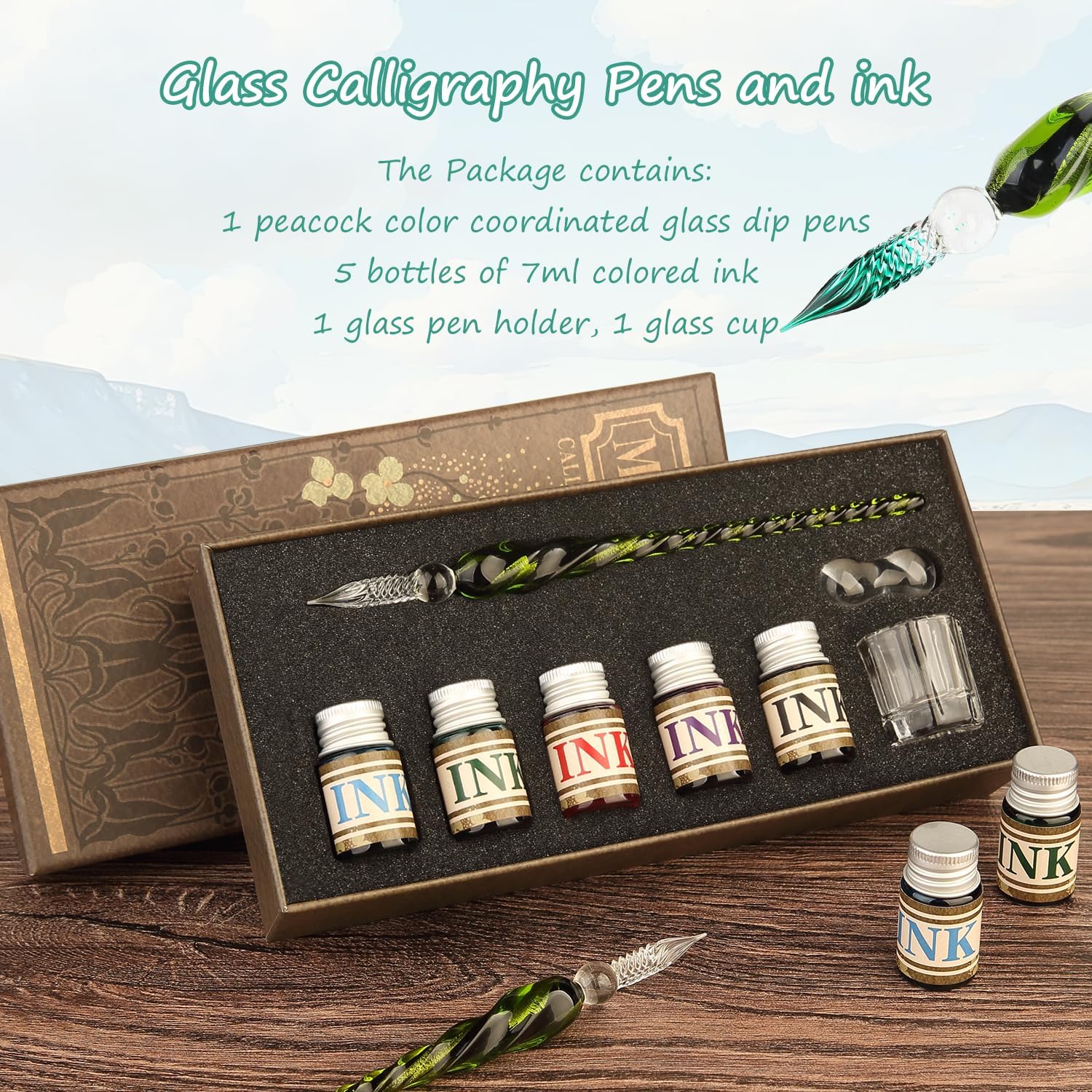 Mancola Glass Dipped Crystal Calligraphy Pen Set with 5 Colorful India Ink, 1 Pen Holder, 1 Cleaning Cup, Ink Drip Tool, Signatures, Drawing, Decoration Kits for Beginners