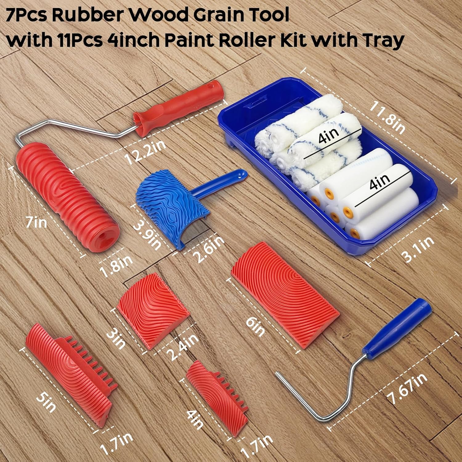 - 【18PCS Wood Grain Tool Set with Paint Roller Kit】The wood graining tool set includes 1 x 7-inch wood texture roller, 1 x 4-inch wood grain rocker tool, and 4 x rubber wood grain tools (3in, 4in, 5in, and 6in) to create a variety of wood grain patterns. Perfect for both fine details and larger textures, this wood graining tool set also includes a 12pcs paint roller kit, providing everything you need to achieve realistic wood finishes