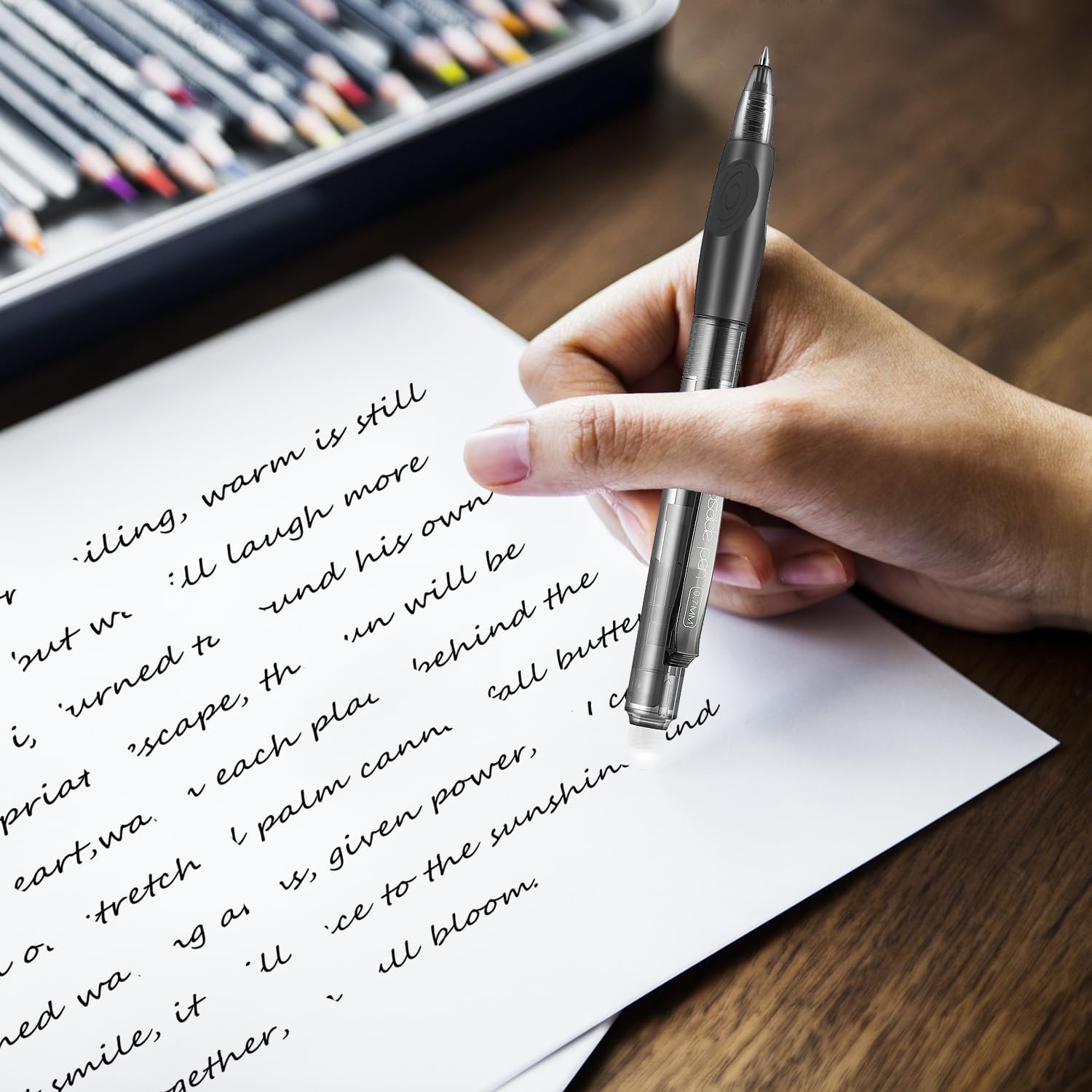 - Smooth Writing and Rewriting: Aozora gel pen can be erased with the eraser on the top and can be retracted by pressing the side clicker clip. They write like a gel pen and erase like a pencil (please wait until the ink is completely dry). It doesn't leave room for mistakes or a hole in the paper. Keep paper or books neat and tidy.
