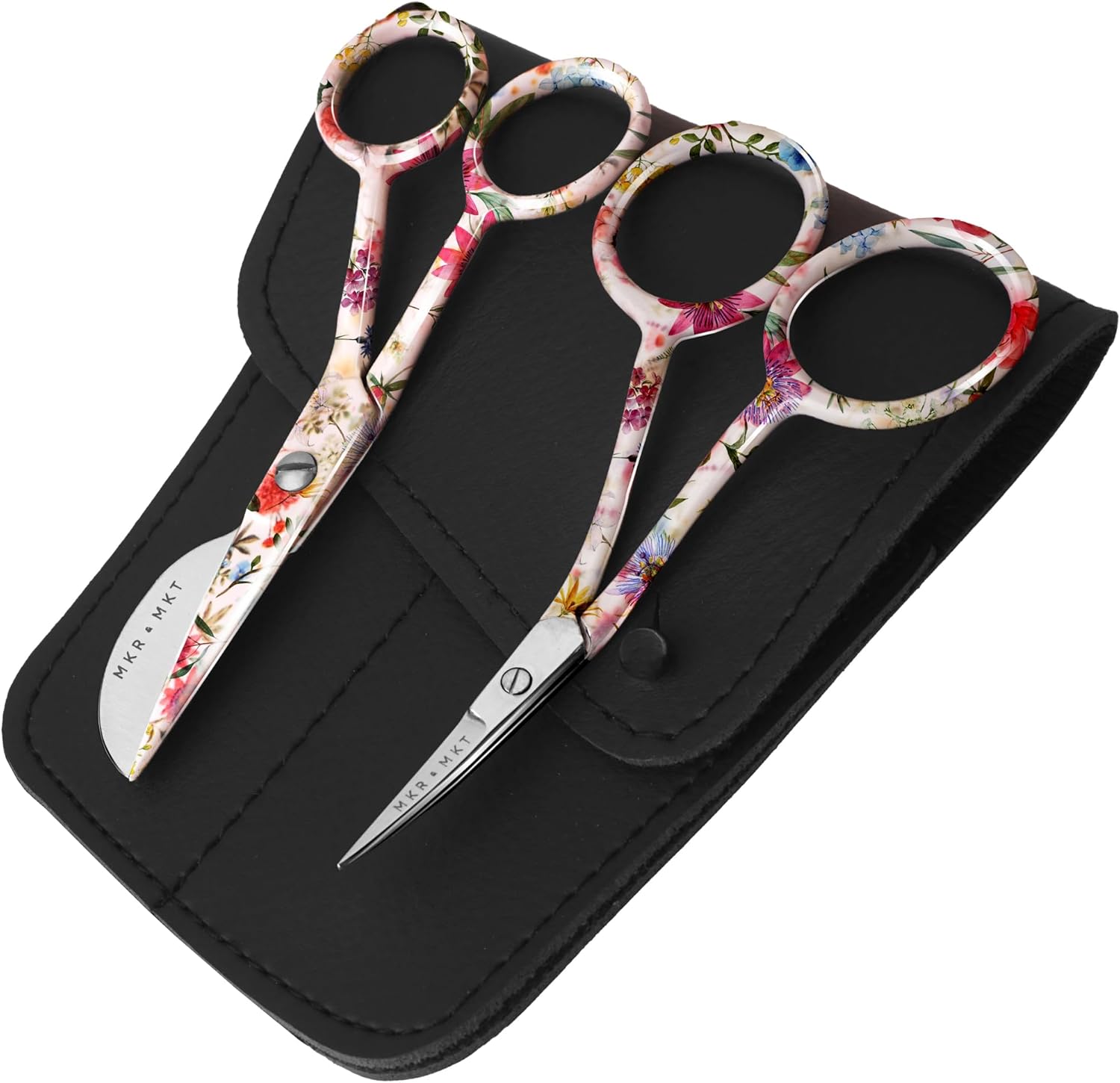 - ✂️ A Hand-Crafted Experience - featuring a set of 2 scissors in quality steel, a smooth and sleek floral pattern, comfortable ergonomic double bend handles and sharp blades in a protective storage pouch.