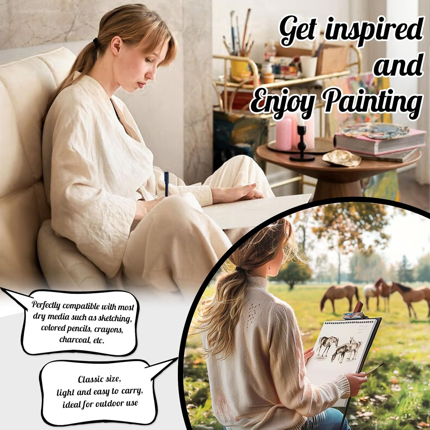 - 【Ready-to-use Studio Features】Reinforced hard cover backing replaces bulky drawing tables. Matte laminated sketchbook stands up to the wear and tear of travel - perfect for outdoor drawing, urban sketching or classroom assignments