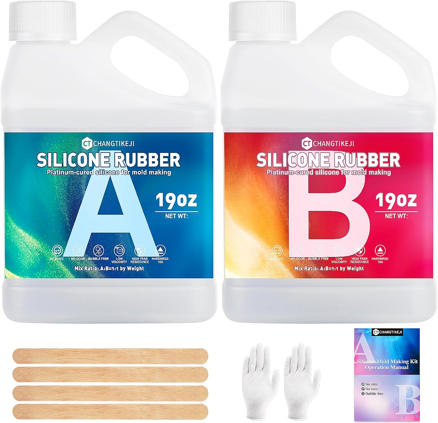 - 【38oz Mold Making Kit】: This silicone mold making kit comes with 2 bottles of liquid silicone, each bottle containing 550g/19oz of platinum cure silicone, as well as 4pcs wooden mixing sticks,2pcs disposable protective gloves,a perfect slicone mold kit for beginners to try,satisfying your various needs.
