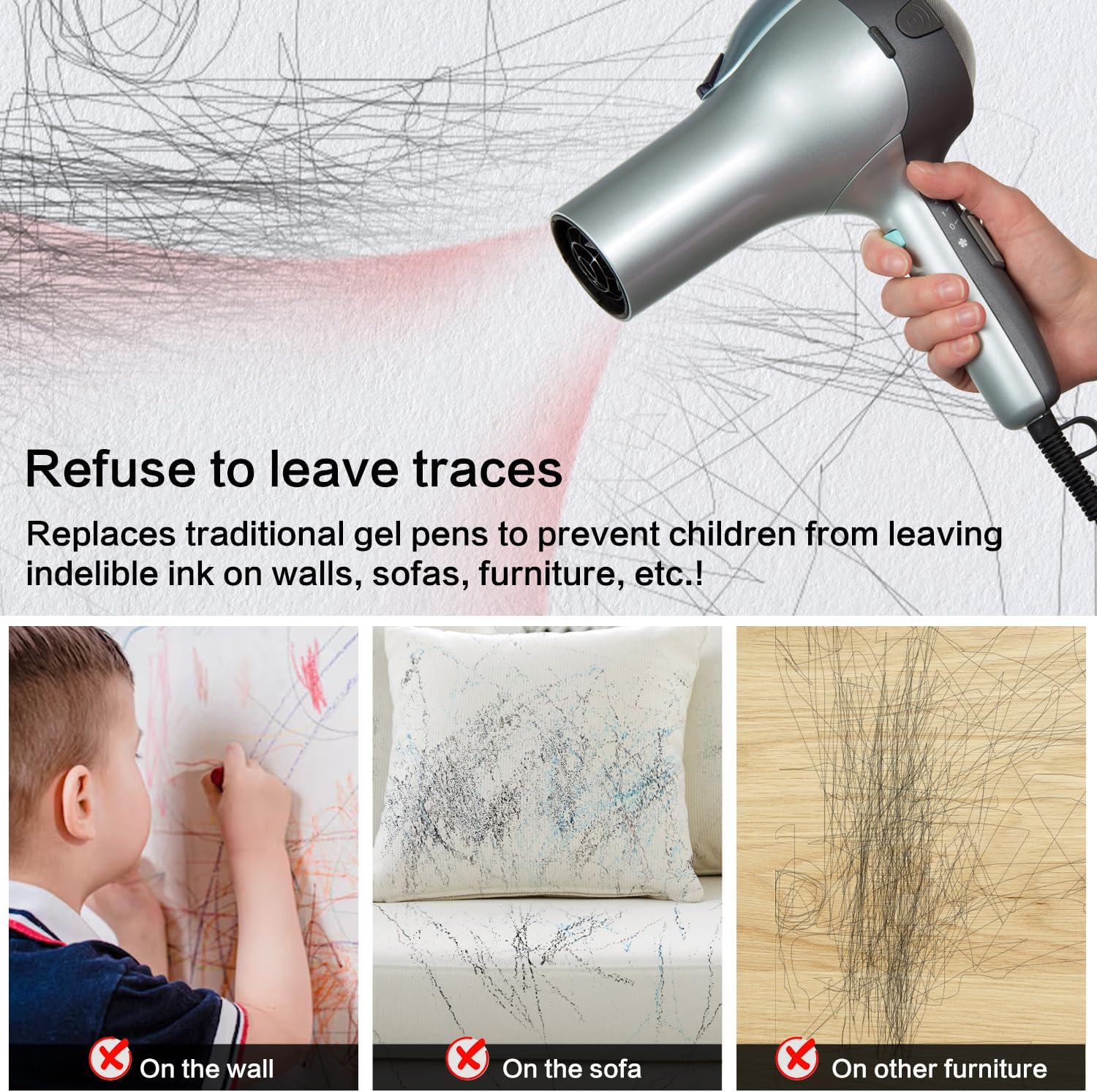 - 【Invisible Ink Pen】:If your kids love to doodle at home, regular ballpoint pens may leave hard-to-remove ink marks on sofas, furniture, or walls. In contrast, the ink of the heat-erasable fabric marker can be easily removed with a high-temperature iron or hot hair dryer, making it a cleaner alternative to traditional ballpoint pens. It can also be used as a temporary marker.