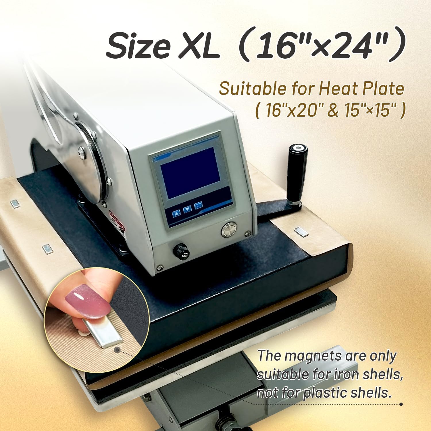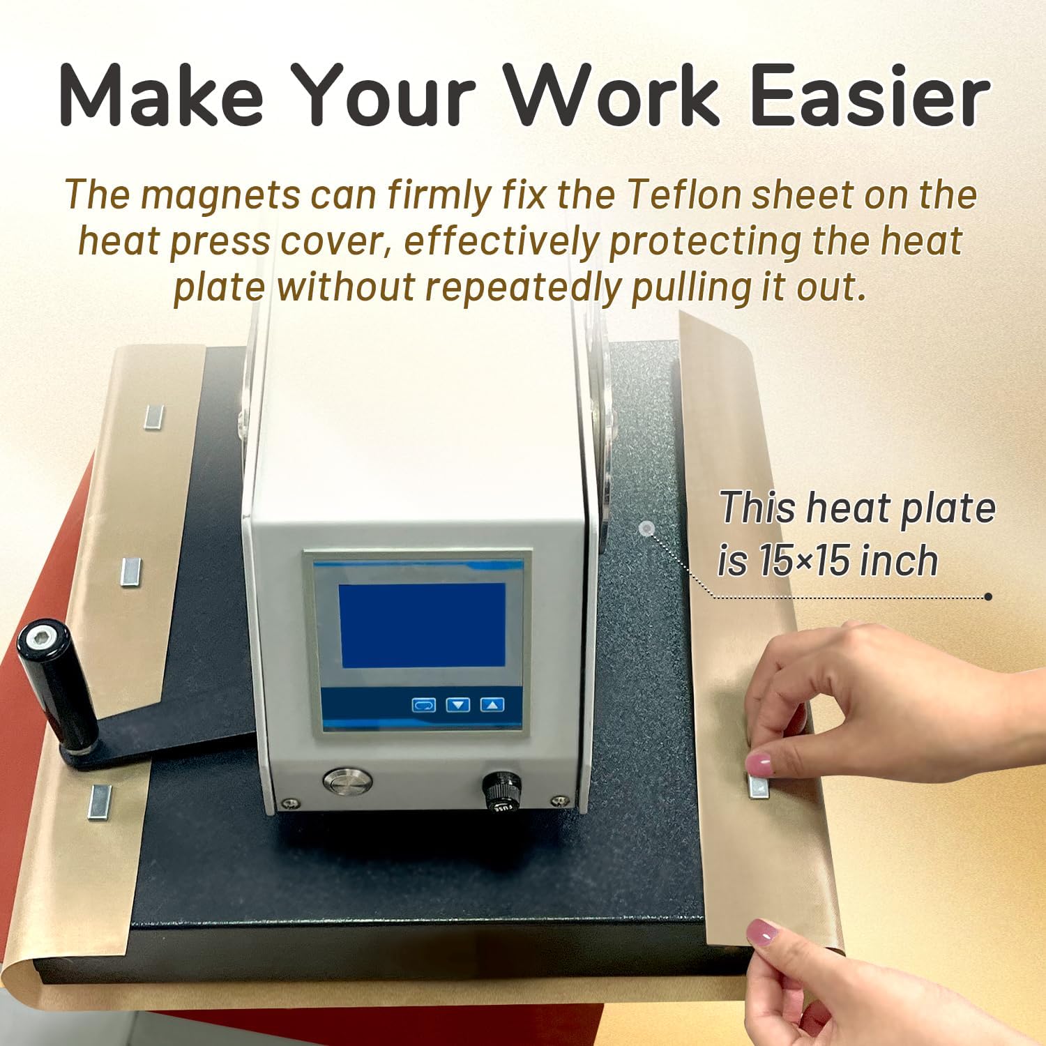 - π΅ Features and Benefits π΅ Size XL: Includes 3 sheets of 16"Γ24" Teflon paper and 6 strong magnets. The Teflon paper can be flipped to wrap the heating plate, while the magnets securely hold it in place. Designed for iron shell heat presses with iron plate areas of 16"Γ20" or 15"Γ15" (not suitable for plastic shell presses), itβs perfect for heat transfer, sublimation, HTV vinyl, DTF, and crafts. The powerful magnets reduce the need for repeated adjustments, boosting efficiency and ensuring a smooth workflow!