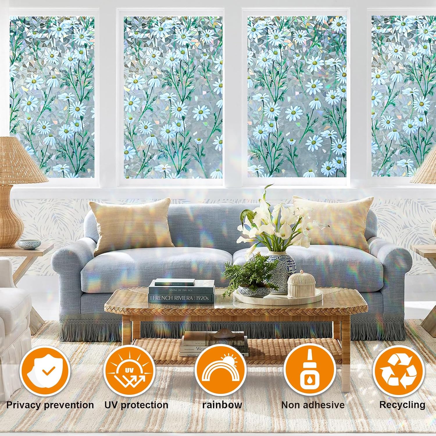 Window Privacy Film Stain Glass Window Film Rainbow Window Film Window clings Non-Adhesive Reusable Decorative for Room (Daisy Rainbow, 23.6 x 78.7 in)