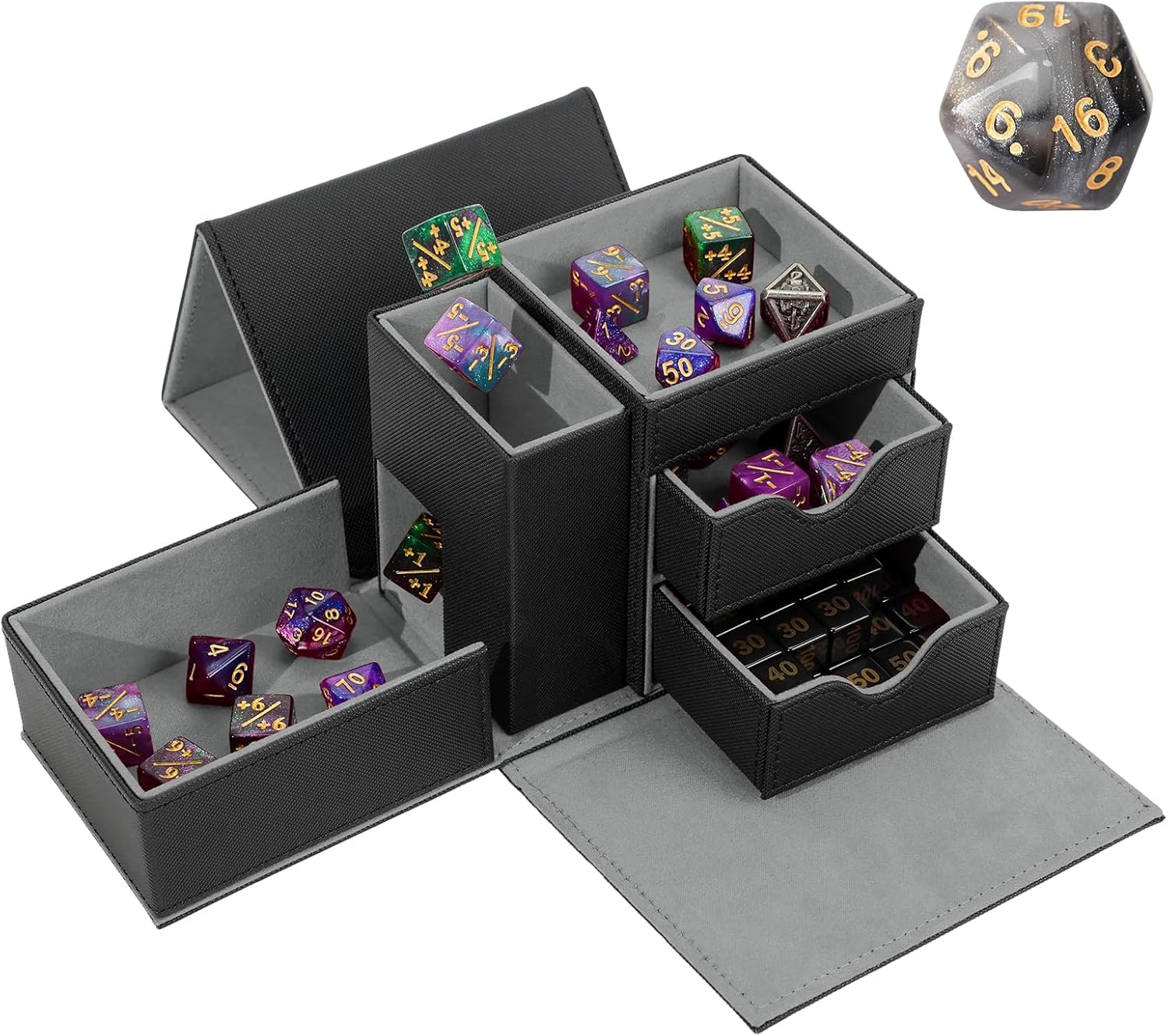 Dice Tray & Dice Tower Storage Box, 3 in 1 Dice Holder Case (Dice Rolling Tray, Dice Rolling Tower, Dice Storage Drawers), Leather Magnetic Closure DND Accessories Gifts for RPG MTG, Black/Grey