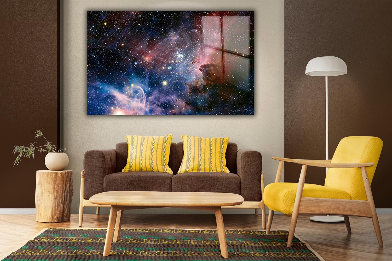 - Premium Tempered Glass: High-quality, scratch-resistant glass with a sleek, polished finish. This is a Stunning Nebula painting printed on a high quality tempered glass comes with wall mount.