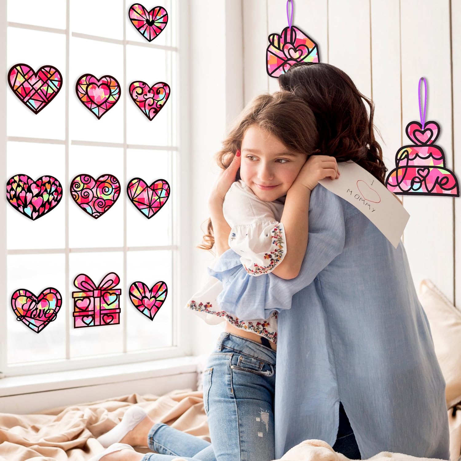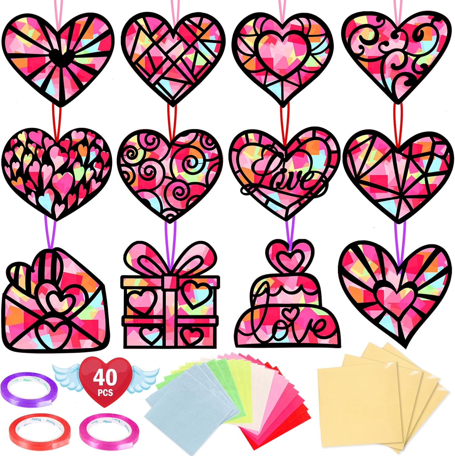 Renbuzhu 40PCS Valentines Day Crafts: Paper Heart Suncatchers, Valentine's Classroom DIY Kits, Window Stained Glass Effect Art Supplies