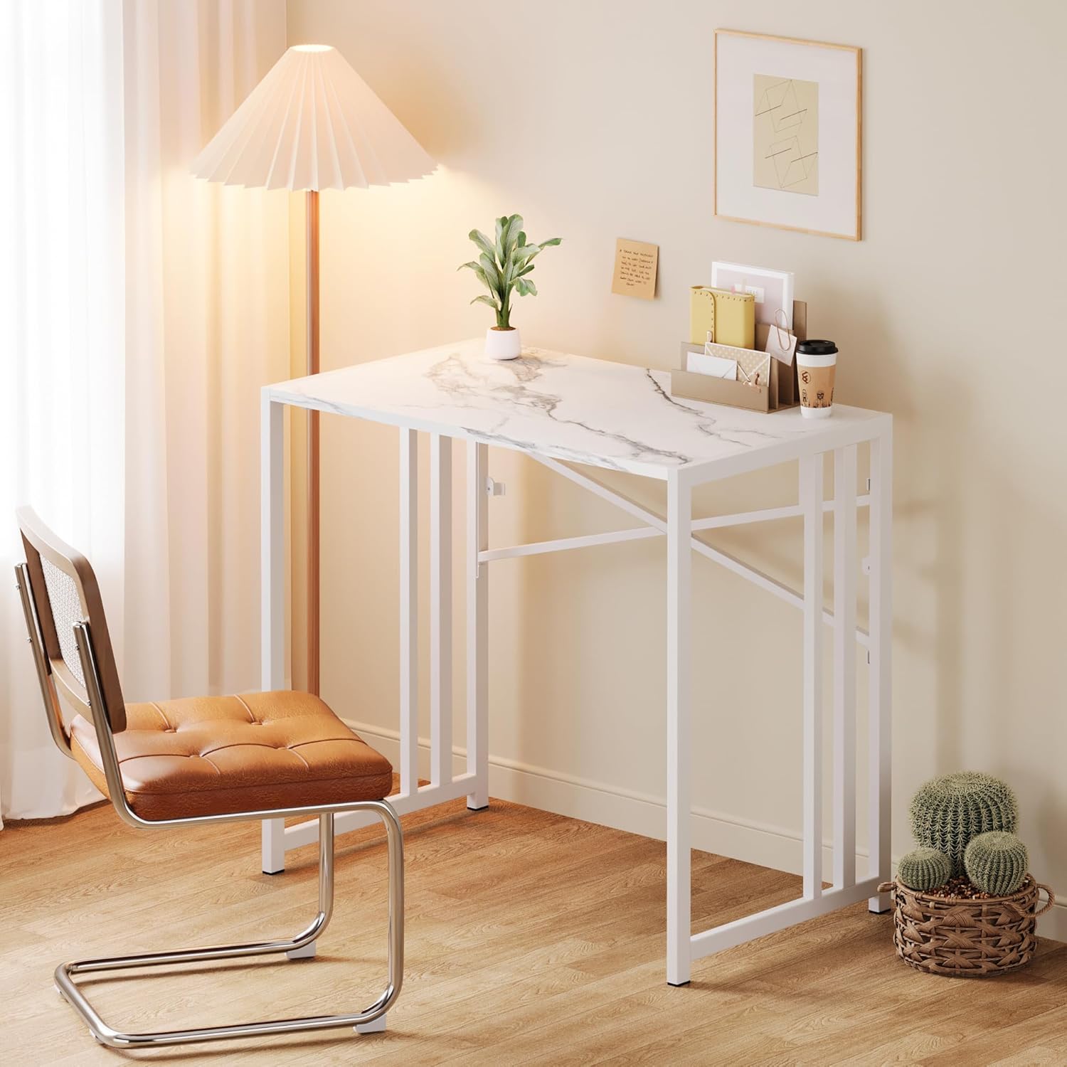 35 inch Folding Small Desk, Writing Gaming Computer Camping Desk for Small Spaces, No Assembly Required Home Office Table, White Marble