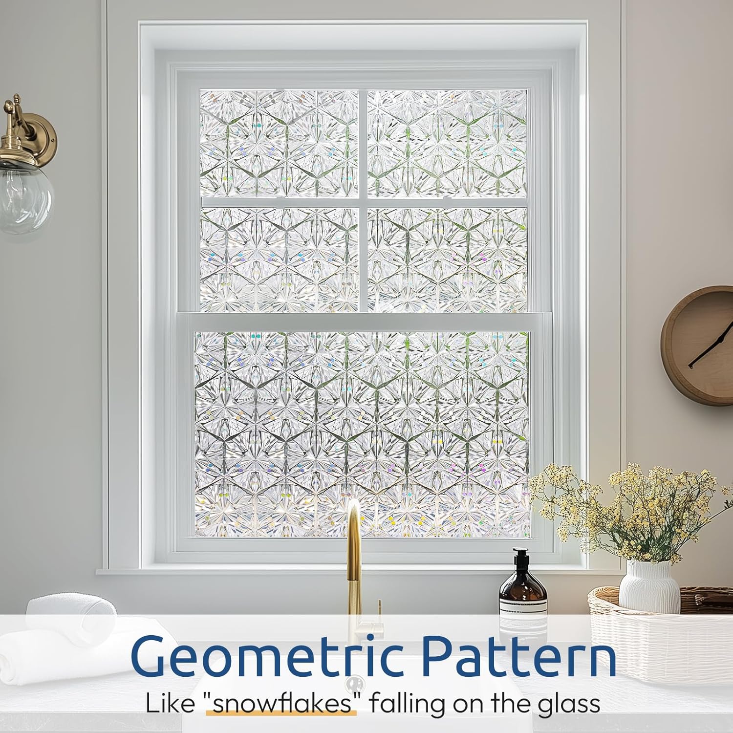 - Prismatic Geometric Brilliance: Featuring symmetrical starburst and snowflake patterns, this decorative window film creates stunning 3D effects under different sunlight angles, adding modern elegance and natural charm to your house